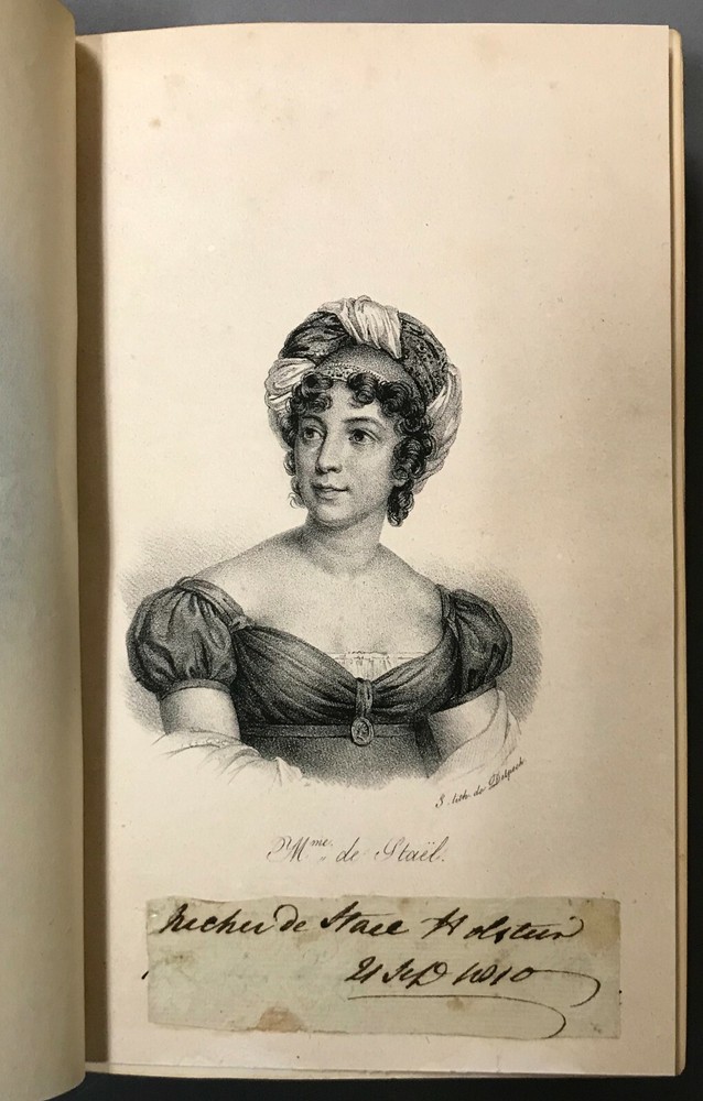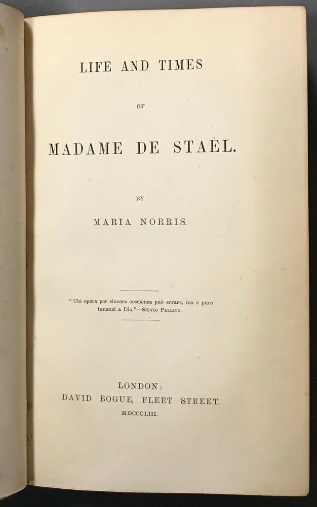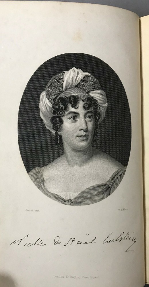 1st Edition/Clipped Signature Life and Times of Madame De Staël D. Bogue 1853 Maria Norris. Life and Times of Madame De Staël . London: David Bogue, 1853. First edition. Octavo. 388pp. Engraved portrait frontispiece and additional tipped-in engraved portrait, with clipped signature. Handsomely rebound in full polished calf; gilt to spine and boards; five raised bands; top edge gilt; gilt tooled turn-ins over marbled boards. Extremities gently rubbed and edgeworn, light toning throughout; bookplate. Very good. RJL-00054A