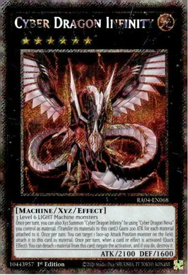 Game: Yu-Gi-Oh! Card: Cyber Dragon Infinity (Platinum Secret Rare) - 1st Edition Set: Quarter Century Stampede Condition: Near Mint Card Details Number: RA04-EN068 Description: 3 Level 6 LIGHT Machine monsters Once per turn, you can also Xyz Summon "Cyber Dragon Infinity" by using "Cyber Dragon Nova" you control as material. (Transfer its materials to this card.) Gains 200 ATK for each material attached to it. Once per turn: You can target 1 face-up Attack Position monster on the field; attach it to this card as material. Once per turn, when a card or effect is activated (Quick Effect): You can detach 1 material from this card; negate the activation, and if you do, destroy it. Rarity: Platinum Secret Rare Card Type: Xyz/Effect Monster Monster Type: Machine Attribute: LIGHT Attack: 2100 Defense: 1600 Located in the Greater Toronto Area - Back to Back Games specializes in trading cards and sports cards. Regarding Sports Cards Condition Raw condition for Modern cards - Unless otherwise noted, raw modern cards are listed in Near Mint-Mint condition or better. A NM-MT card appears to be Mint at first glance, but upon closer inspection, may exhibit some of the following: minor print defects (e.g. roller marks, print line, dimple), minor scratches, slight edge wear, and slight corner wear. Centering is clearly visible in the images provided and does not factor into our condition assessment. Raw condition for Vintage cards : Unless otherwise noted, raw vintage cards are listed in Excellent condition or better. An EX card may exhibit some of the following: minor rounding of corners, surface wear, print defects, light scratches, and slight edge wear/chipping. Centering is clearly visible in the images provided and does not factor into our condition assessment. Regarding Trading Card Conditions Near Mint (NM) - Cards in Near Mint condition show minimal to no wear from shuffling, play or handling and can have a nearly unmarked surface, crisp corners and unblemished edges outside of a few minimal flaws. A Near Mint card may have a tiny edge nick or a tiny scratch or two, but overall look nearly unplayed with no major defects or flaws. Lightly Played (LP) - Cards in Lightly Played condition may have minor border or corner wear or even just slight scuffs or scratches. There are no major defects such as water damage, bends or issues with the structural integrity of the card. Noticeable imperfections are okay, but none should be too severe or at too high a volume. Moderately Played (MP) - Cards in Moderately Played condition exhibit condition issues visible at a casual glance. Cards in Moderately Played condition can have border wear, corner wear, scratching or scuffing, creases or whitening, minor dirt buildup or any combination of mild examples of these marks. A Moderately Played card may have some form of a more major marking, such as spot water damage or creasing that doesnʼt affect card integrity, but not in combination with other issues such as scratches, scuffs or border/edge wear and not impacting a large area of the card. Heavily Played (HP) - Cards in Heavily Played condition show a severe amount of wear. Heavily Played condition can include cards that have major creasing, major whitening, major border wear or any combination of those flaws. (These flaws cannot prevent the card from being tournament playable when sleeved.) Damaged - Cards in Damaged condition can exhibit a tear, bend or crease that may make the card illegal for tournament play, even in a sleeve. Cards in Damaged condition may have extreme border wear, extreme corner wear, heavy scratching or scuffing, folds, creases or tears or other damages that impacts the structural integrity of the card. Shipping Combined shipping for multiple items is available at no additional charge. To receive combined shipping, please ensure all desired items are in your eBay shopping cart before proceeding to checkout. We automatically combine multiple orders placed on the same day. If you place multiple orders on the same day, please contact us to request a refund of applicable shipping costs. Most Items will be shipped in a bubble mailer w/Top Loader Orders over # Signature confirmation may be required on invoices over $400. Many factors may contribute to delays in delivering the package such as weather and customs. Especially with the pandemic items may be delayed, please contact if you have any questions regarding your shipping International shipping When a package ships internationally, it may be subject to import taxes, customs duties, and other fees imposed by the destination country. These charges are typically due once the package arrives in the destination country. Buyers are responsible for paying these additional costs. Back to Back Games is unable to predict which of these fees, if any, will be applied, and we do no Feedback: We will always leave positive feedback for you and we ask if you can do the same for us. If there is any reason why the transaction was not up to your expectations, please message us before leaving feedback so we can address the issue.