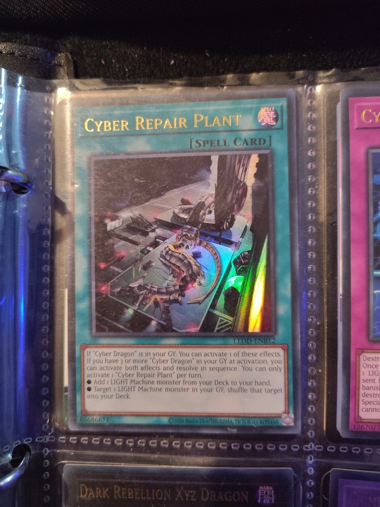 | Card Text | If "Cyber Dragon" is in your GY: You can activate 1 of these effects. If you have 3 or more "Cyber Dragon" in your GY at activation, you can activate both effects and resolve in sequence. You can only activate 1 "Cyber Repair Plant" per turn. • Add 1 LIGHT Machine monster from your Deck to your hand. • Target 1 LIGHT Machine monster in your GY; shuffle that target into your Deck. |