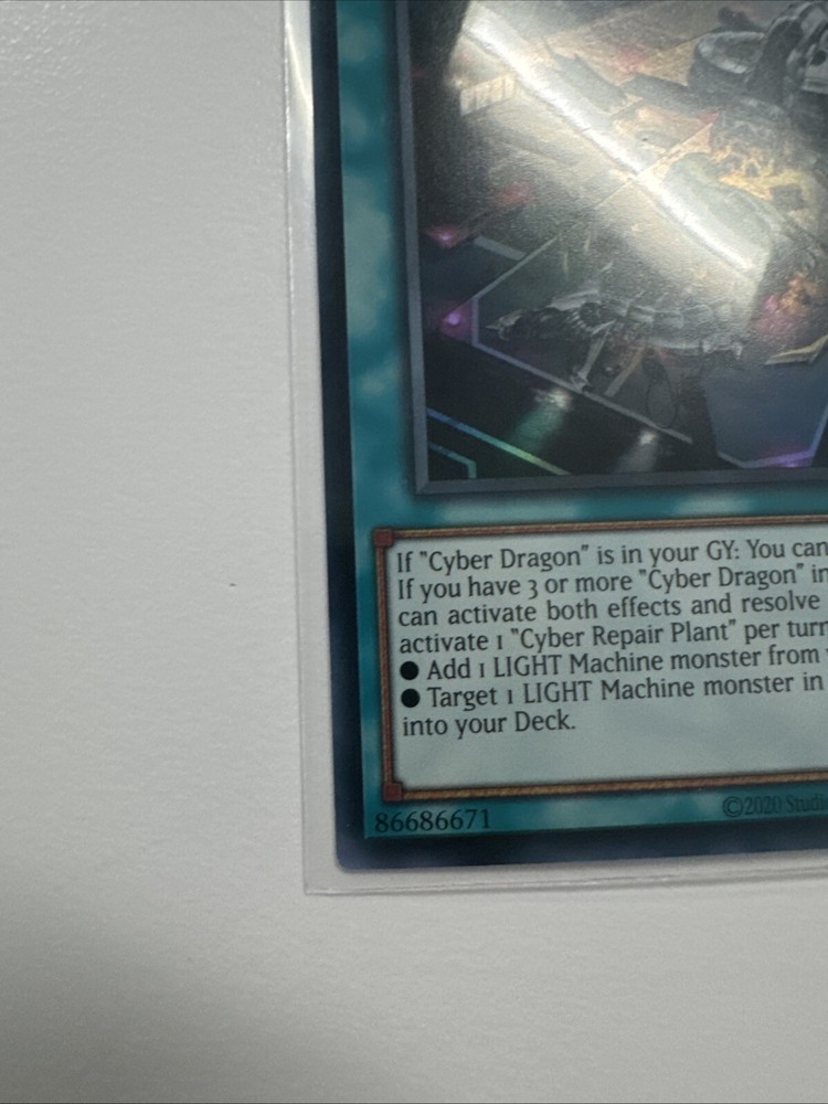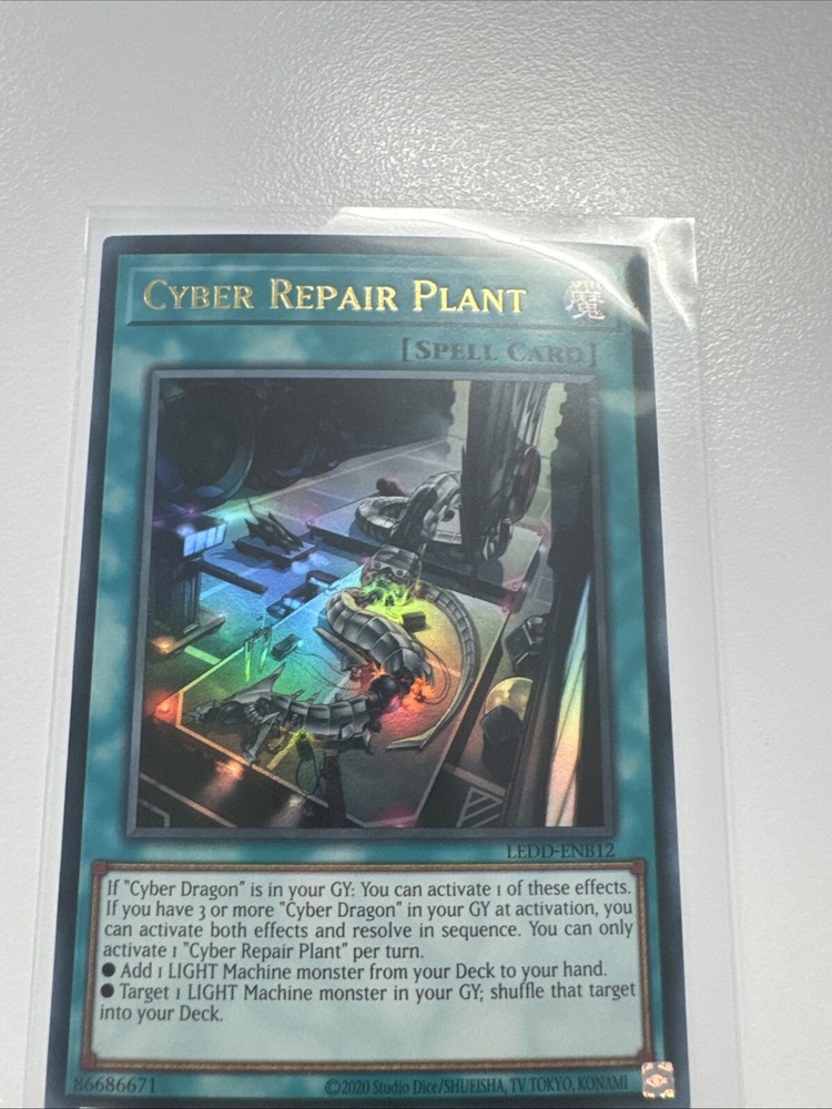 | Card Text | If "Cyber Dragon" is in your GY: You can activate 1 of these effects. If you have 3 or more "Cyber Dragon" in your GY at activation, you can activate both effects and resolve in sequence. You can only activate 1 "Cyber Repair Plant" per turn. • Add 1 LIGHT Machine monster from your Deck to your hand. • Target 1 LIGHT Machine monster in your GY; shuffle that target into your Deck. |