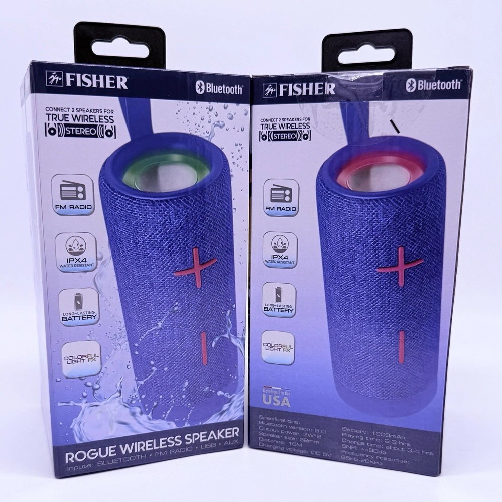 Upgrade your audio experience with this set of two Fisher Rogue True Wireless Speakers! These compact, oval-shaped speakers allow you to connect both for True Wireless Stereo (TWS), delivering immersive sound. Features: • True Wireless Stereo (TWS): Pair both speakers together for a surround sound experience. • Bluetooth 5.0: Reliable connection with up to 10 meters (33 feet) of range. • Water-Resistant Design: Perfect for indoor and outdoor use. • FM Radio: Tune in to your favorite stations. • Multiple Inputs: AUX & USB connectivity for versatile playback options. • Long-Lasting Battery: 1200mAh battery provides 2-3 hours of playtime per charge. • Compact & Stylish: Sleek blue design complements any setup. • Charging Time: 3-4 hours via DC 5V input. • Speaker Size: 52mm driver for rich, clear sound. Enjoy music wherever you go with these Fisher Rogue Wireless Speakers! Includes both speakers and charging cables. Fast shipping! Buy with confidence.