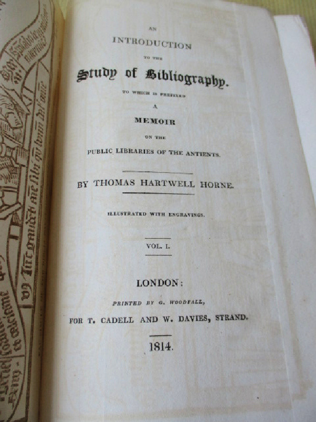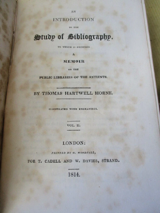 A1326. 2 Volumes by Thomas Hartwell Horne, pub'd. T.Cadell and W.Davies, London, 1814, First Edition. Octavo, dark brown polished leather with gilt outline decor. Both spines repaired with dark brown cloth. Endpapers foxed. Texts are tight and clean. Marbled end and edges. Moderate wear. Vol. 1, 402 pages and several pull-out illustrations. Vol. 2, pages 403 to 788, plus 156-page Appendix. Good thus condition. PLEASE NOTE: These books have rudimentary repairs......not professional, but with enough skill to make them serviceable. Do not hesitate to e-mail with any questions. As Always, Satisfaction Guaranteed! I expect to receive payment within 10 days, unless we have made other arrangements. Shipping will be USPS Media mail or Priority, if requested. I'm glad to combine multiple purchases in order to minimize shipping costs. I WILL SHIP INTERNATIONALLY, and I try to be as economical as possible with the shipping costs. RETURN POLICY: Satisfaction Guaranteed! Track Page Views With Auctiva's FREE Counter