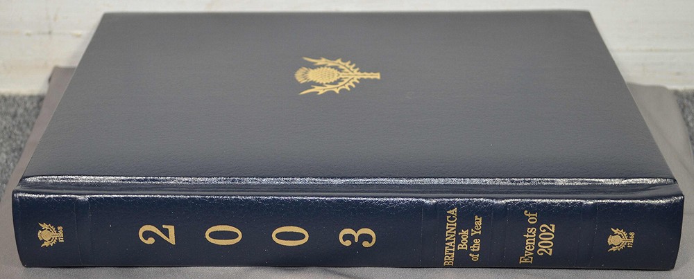 2003 Britannica Book of the Year for events in 2002 - Leather Bound. This 2003 Britannica Book of the Year is in excellent condition, does not look like it was used! This Britannica Book of the Year makes for a great gift to someone born in 2002! Thanks for looking at my items. Colors of items may vary due to lighting, photography, and computer screen color variations. Please check photo's carefully as that is part of the description and are photo's of the actual item you will receive. If it is not in the photo it is not included, please check closely. We reserve the right to choose the shipping method unless you send us a note requesting a quote on a specific shipping service prior to your purchase. Please check out my other items as we are listing new items almost daily.
