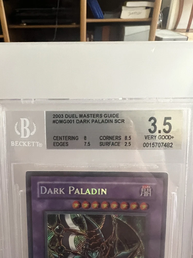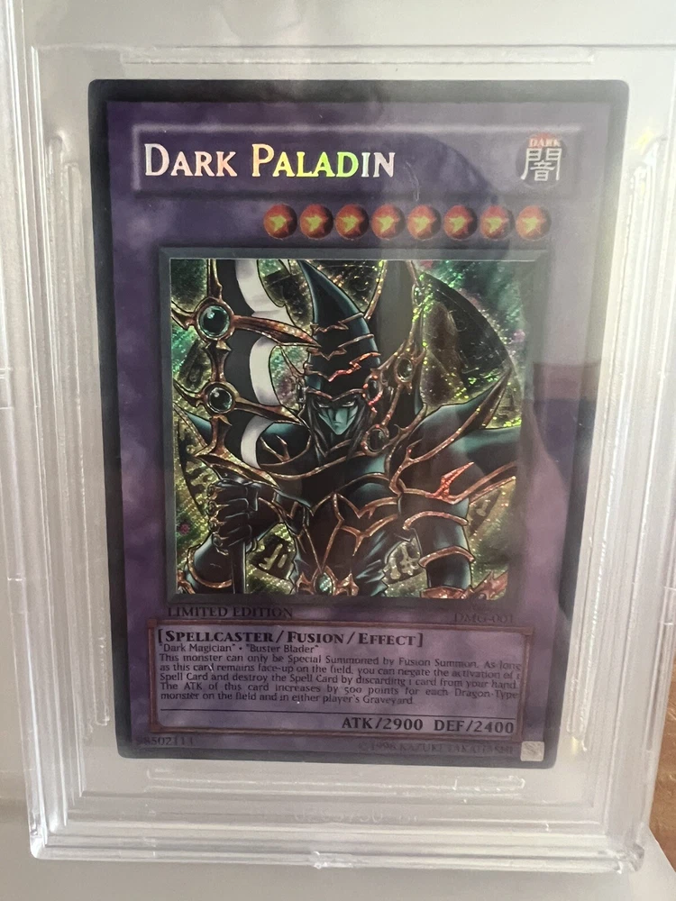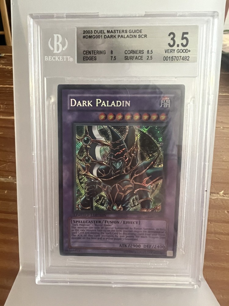 This limited edition 2003 Dark Paladin card is a must-have for any Yu-Gi-Oh! TCG collector. With a fusion/effect monster card type and a powerful attack power of 2900, this English language card features a beautiful foil finish and is graded 3.5 by Beckett Grading Services (BGS). It comes from the Duel Master's Guide set and has a secret rare rarity. This Dark Paladin card is perfect for fans of the Spellcaster creature/monster type and the Dark character. Its certification number is 0015707482 and it has a card number of DMG001. Although it is a used card, it is in very good+ condition and made from high-quality card stock material. Add this Japanese card size card to your collection today!