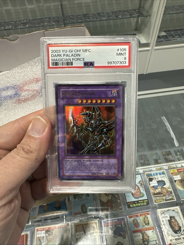 The 2003 YU-GI-OH! Dark Paladin MFC-105 PSA 9 Mint card is a vintage, ultra rare collectible card from the Magician's Force set. It features the character Dark Paladin, a spellcaster creature with 2900 attack power and 2400 defense. Manufactured by Konami, this Japanese-sized card is part of the Yu-Gi-Oh! TCG and is in English language. With a holo finish and fusion type, this card is a must-have for collectors and players alike.