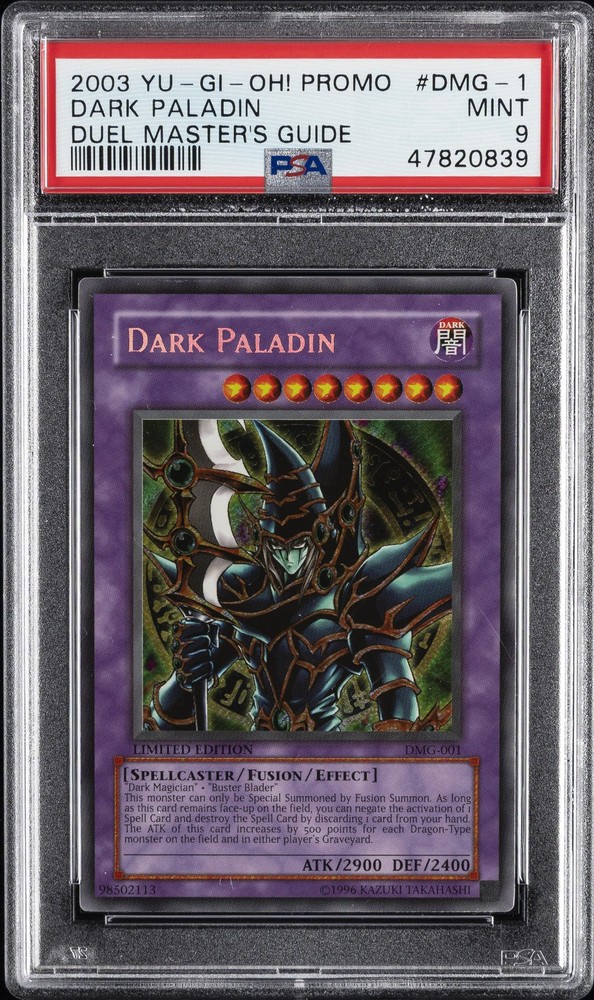 2003 YU-GI-OH! PROMO DUEL MASTER'S GUIDE #001 DARK PALADIN PSA 9 2003 YU-GI-OH! PROMO DUEL MASTER'S GUIDE #001 DARK PALADIN PSA 9 Purchase Info Thank you for your interest in this item consigned with PSA! By purchasing or making an offer on this item, you acknowledge and agree to the following terms: All sales are final. Returns not accepted. Payment must be made upon purchase of the item. All items are sold "as is" and without warranty of Collectors Universe, Inc. (d/b/a PSA), and ANY AND ALL IMPLIED WARRANTIES ARE DISCLAIMED AND EXCLUDED. Sales tax may apply depending on shipping address. PSA does not guarantee that another third-party grading company's authentication or certification of an item as genuine is correct or accurate. Neither a difference of opinion between third-party grading companies about authenticity, nor a company's subsequent reversal of its earlier authentication or certification of an item, will be a basis for rescinding a sale. Any dispute with another third-party grading company relating to the authenticity of an item must be resolved directly with that other company. Collectors' maximum liability in the event of loss or damage to an item during shipping will be the lesser of (a) the price paid for the item and (b) the change in fair market value of the item. You release Collectors from all other liability including for any claims of punitive damages, emotional distress, consequential damages, lost profits, or lost interest, except as prohibited by law. Shipping Purchased Items will be shipped directly from PSA Vault. You stay hands-free. PSA Vault When you purchase this item, you can save on sales tax and selling fees by keeping it in the PSA Vault, official Vault of eBay. Items already in PSA Vault and will be sent to PSA Vault will have no shipping charge Storage of any items with the PSA Vault will be subject to the PSA Vault Terms of Service. Consignment PSA has competitive rates on the world's largest collectibles marketplace with the option to list from the PSA Vault or immediately after PSA authentication and grading. Sale Price Under $100 $100 - $499 $500 - $999 $1,000 - $2,499 $2,500 - $4,999 $5,000+ Seller Fee 16% 14% 13% 10% 9% 7% Sellers pay a single fee as reflected above; no additional eBay fees are incurred. There is a $5 minimum fee on sold items.