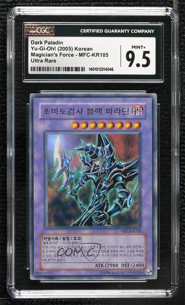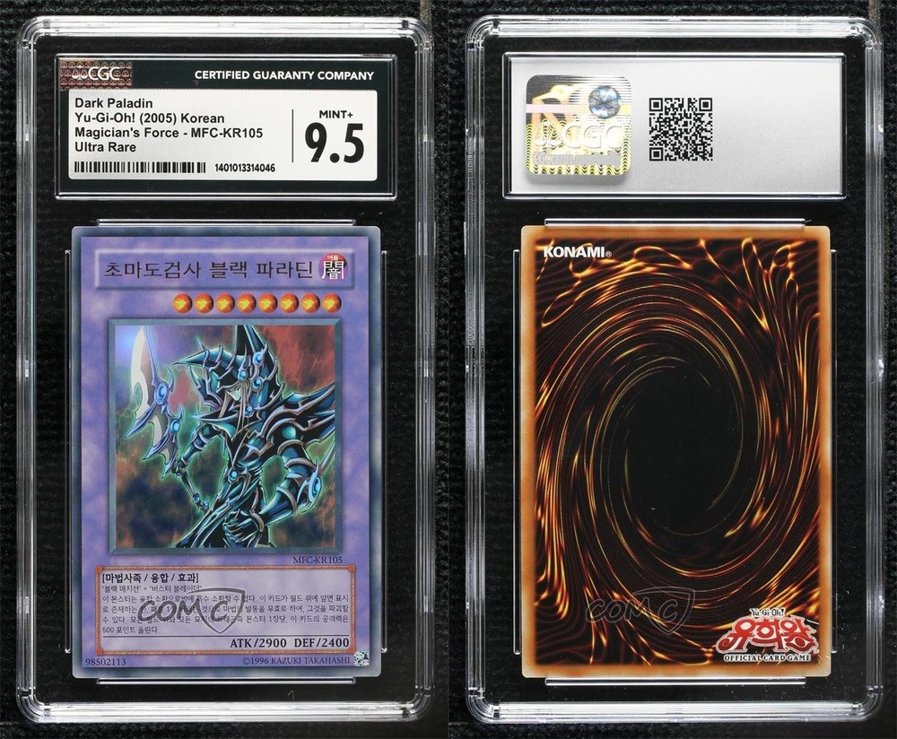 2003 Yu-Gi-Oh! - Magician's Force - [Base] - Korean Unlimited #MFC-KR105 Dark Paladin (UR) Graded CGC 9.5 Mint+ COMC Item: 190567346 - YuGiOh Card - Featuring Dark Paladin Search for more: 2003 Yu-Gi-Oh! - Magician's Force Search for more: 2003 Yu-Gi-Oh! - Magician's Force - [Base] - Korean Unlimited View all of our Listings Auctions Buy It Now About Us Located in the beautiful Pacific Northwest, COMC (Check Out My Cards) is the world's largest consignment service for trading card singles. More than 10,000 people have used our consignment service to list over 50 million trading cards. Find out how we can help you consign your items on eBay by contacting us through eBay messaging. COMC -- "The Safe & Easy Way to Buy & Sell" Raw Condition for Modern Cards Unless otherwise noted, raw modern cards are listed in Near Mint-Mint condition or better. A NM-MT card appears to be Mint at first glance, but upon closer inspection, may exhibit some of the following: minor print defects (e.g. roller marks, print line, dimple), minor scratches, slight edge wear, and slight corner wear. Centering is clearly visible in the images provided and does not factor into our condition assessment. Raw Condition for Vintage Cards Unless otherwise noted, raw vintage cards are listed in Excellent condition or better. An EX card may exhibit some of the following: minor rounding of corners, surface wear, print defects, light scratches, and slight edge wear/chipping. Centering is clearly visible in the images provided and does not factor into our condition assessment. Domestic Shipping Combined shipping for multiple items is available. To receive combined shipping, please ensure all desired items are in your eBay shopping cart before proceeding to checkout. eBay limits orders to 40 items per order. We automatically combine multiple orders placed on the same day. If you place multiple orders on the same day, please contact us to request a refund of applicable shipping costs. Signature confirmation may be required on invoices over $400. All cards are protected and shipped securely. International Shipping COMC offers eBay's International Shipping (EIS) for international orders under $2,500* (see country exceptions below). All duties and import fees are paid at checkout; in the rare event that there are additional import fees upon delivery, these are borne by the buyer. EIS packages route through a shipping hub in Erlanger, KY before shipping to their final destination. Please note that EIS does not allow for combined shipments. The shipping rates are determined by eBay and cannot be adjusted. *Maximum sale price exceptions: Colombia, Kuwait ($2,000); Taiwan ($1,539); Chile, Costa Rica, Guatemala, Honduras, Trinidad and Tobago ($1,000); Antigua and Barbuda, Aruba, Belize, Dominica, Grenada, Philippines, Saint Kitts and Nevis, Saint Lucia, Montserrat, Turks and Caicos Islands ($500); Dominican Republic, El Salvador ($200). Please request a shipping quote through eBay messaging for orders that exceed the maximum sale price supported by eBay's International Shipping. You will be responsible for all duties and import fees for international orders shipped outside the EIS. All cards are protected and shipped securely. Payment COMC does not accept offers on our cards through our eBay storefront. COMC utilizes eBay’s managed payments system. If you are experiencing difficulties making a payment, please contact eBay for assistance. Return Policy Returns are only accepted on the rare occasion the item is not as described. If you are making a return, please initiate the return process through eBay so a mailing label can be provided for you. Prior to listing, our expert team carefully assessed this item to represent it accurately. Please review the description and high-definition images prior to purchasing to ensure this item meets your satisfaction. We welcome you to contact us if you have further questions about this item. Trust and Integrity COMC carefully assesses each item consigned to us to prevent fraudulent items from entering the marketplace. If you believe an item offered on COMC may be fraudulent, please contact us with details so we can investigate the issue. Items we determine are outside our supported items policy may be removed. Last Modified: 5/7/2025 11:07:21 AM PDT