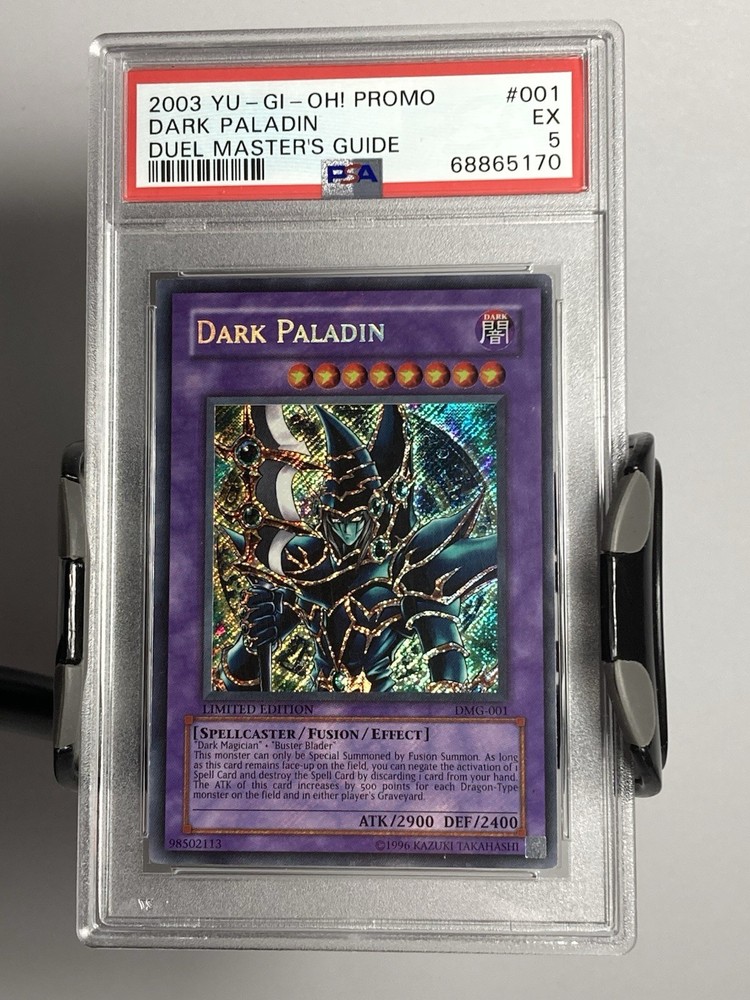 The product is a vintage 2003 Yugioh Dark Paladin Promo card from the Duel Master's Guide set. It is a Secret Rare card with a Holo finish and features a Spellcaster creature/monster type. The card is in English and has the card number DMG-001. It is a Fusion card with a Darkness attribute and was manufactured by Konami. The card is in VG-EX condition and is autographed.