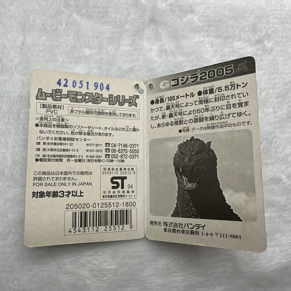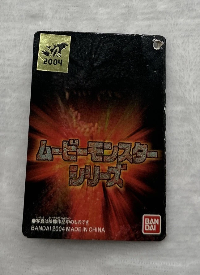 CARD ONLY ..This Godzilla figure from Bandai is a must-have for any fan of the iconic monster. Made in China and released in 2005 as part of the Movie Monster Series, this vinyl figure is a rare collectible. The included card features artwork from the 2004 Godzilla movie and adds to the overall appeal of the item. With attention to detail and quality construction, this Godzilla figure is a great addition to any collection. Fans of the monster will appreciate the unique design and stylized interpretation of the character. Don't miss out on the opportunity to own this fantastic piece of Godzilla memorabilia.