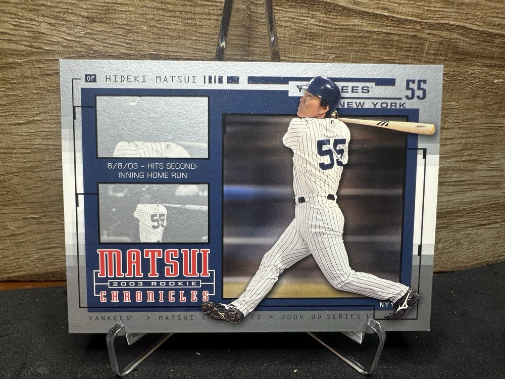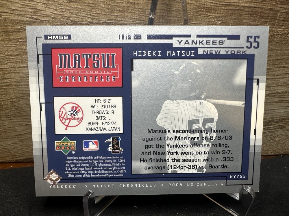 The product is a single-insert trading card featuring Hideki Matsui from the 2004 Upper Deck Matsui 2003 Rookie Chronicles set. This card is an original rookie card of the athlete, Manufactured by Upper Deck in 2004. It is a part of the baseball sport trading cards, specifically highlighting Matsui's rookie season with the New York Yankees. The card number is HM59, and it is a valuable collectible for fans of Hideki Matsui and baseball trading cards.