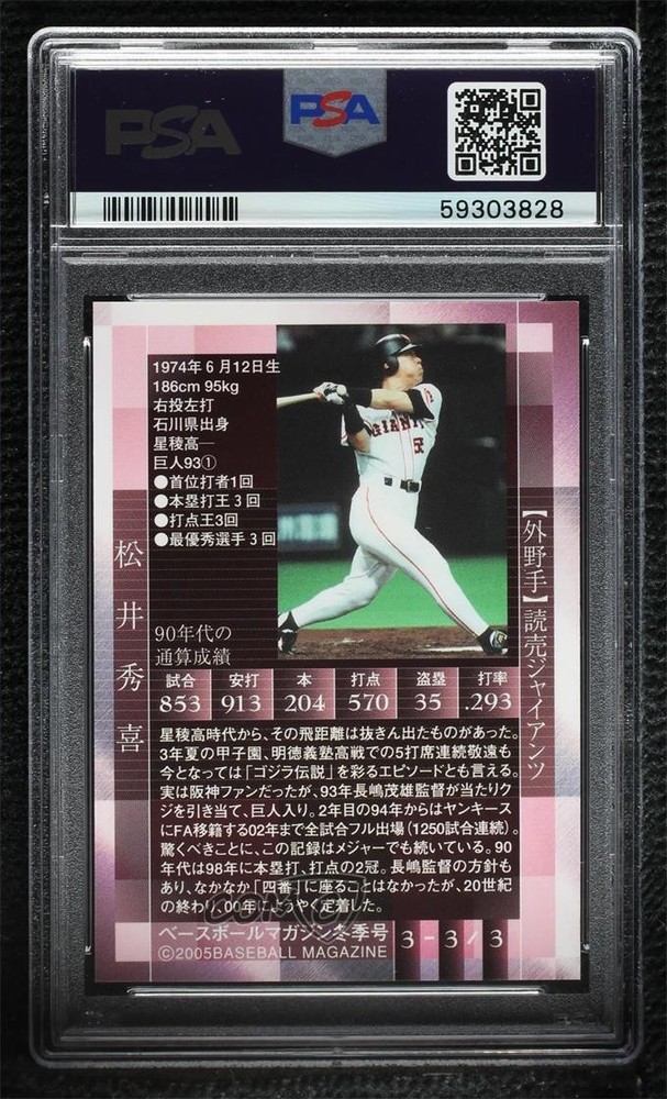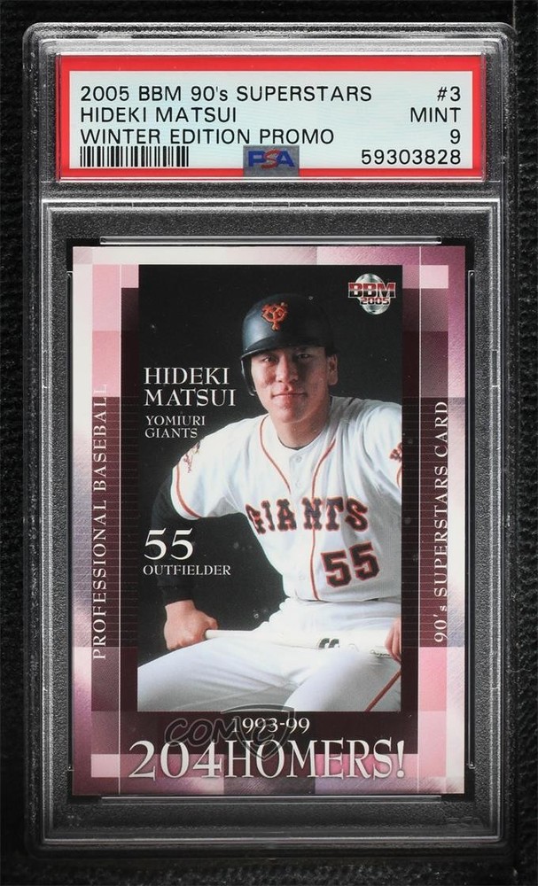 2005 BBM 90's Superstars Winter Edition Promos - [Base] #3 Hideki Matsui Graded PSA 9 MINT - Baseball Card - Featuring the Yomiuri Giants - Featuring Hideki Matsui Search for more: 2005 BBM 90's Superstars Winter Edition Promos Search for more: 2005 BBM 90's Superstars Winter Edition Promos - [Base] View all of our Listings Auctions Buy It Now About Us Located in the beautiful Pacific Northwest, COMC (Check Out My Cards) is the world's largest consignment service for trading card singles. More than 10,000 people have used our consignment service to list over 50 million trading cards. Find out how we can help you consign your items on eBay by contacting us through eBay messaging. COMC -- "The Safe & Easy Way to Buy & Sell" Representative Image - Select Specific Item above to see image of actual item Representative Image - Select Specific Item above to see image of actual item Raw Condition for Modern Cards Unless otherwise noted, raw modern cards are listed in Near Mint-Mint condition or better. A NM-MT card appears to be Mint at first glance, but upon closer inspection, may exhibit some of the following: minor print defects (e.g. roller marks, print line, dimple), minor scratches, slight edge wear, and slight corner wear. Centering is clearly visible in the images provided and does not factor into our condition assessment. Raw Condition for Vintage Cards Unless otherwise noted, raw vintage cards are listed in Excellent condition or better. An EX card may exhibit some of the following: minor rounding of corners, surface wear, print defects, light scratches, and slight edge wear/chipping. Centering is clearly visible in the images provided and does not factor into our condition assessment. Domestic Shipping Combined shipping for multiple items is available. To receive combined shipping, please ensure all desired items are in your eBay shopping cart before proceeding to checkout. eBay limits orders to 40 items per order. We automatically combine multiple orders placed on the same day. If you place multiple orders on the same day, please contact us to request a refund of applicable shipping costs. Signature confirmation may be required on invoices over $400. All cards are protected and shipped securely. International Shipping COMC offers eBay's International Shipping (EIS) for international orders under $2,500* (see country exceptions below). All duties and import fees are paid at checkout; in the rare event that there are additional import fees upon delivery, these are borne by the buyer. EIS packages route through a shipping hub in Erlanger, KY before shipping to their final destination. Please note that EIS does not allow for combined shipments. The shipping rates are determined by eBay and cannot be adjusted. *Maximum sale price exceptions: Colombia, Kuwait ($2,000); Taiwan ($1,539); Chile, Costa Rica, Guatemala, Honduras, Trinidad and Tobago ($1,000); Antigua and Barbuda, Aruba, Belize, Dominica, Grenada, Philippines, Saint Kitts and Nevis, Saint Lucia, Montserrat, Turks and Caicos Islands ($500); Dominican Republic, El Salvador ($200). Please request a shipping quote through eBay messaging for orders that exceed the maximum sale price supported by eBay's International Shipping. You will be responsible for all duties and import fees for international orders shipped outside the EIS. All cards are protected and shipped securely. Payment COMC does not accept offers on our cards through our eBay storefront. COMC utilizes eBay’s managed payments system. If you are experiencing difficulties making a payment, please contact eBay for assistance. Return Policy Returns are only accepted on the rare occasion the item is not as described. If you are making a return, please initiate the return process through eBay so a mailing label can be provided for you. Prior to listing, our expert team carefully assessed this item to represent it accurately. Please review the description and high-definition images prior to purchasing to ensure this item meets your satisfaction. We welcome you to contact us if you have further questions about this item. Trust and Integrity COMC carefully assesses each item consigned to us to prevent fraudulent items from entering the marketplace. If you believe an item offered on COMC may be fraudulent, please contact us with details so we can investigate the issue. Items we determine are outside our supported items policy may be removed. Last Modified: 6/19/2025 6:15:18 AM PDT