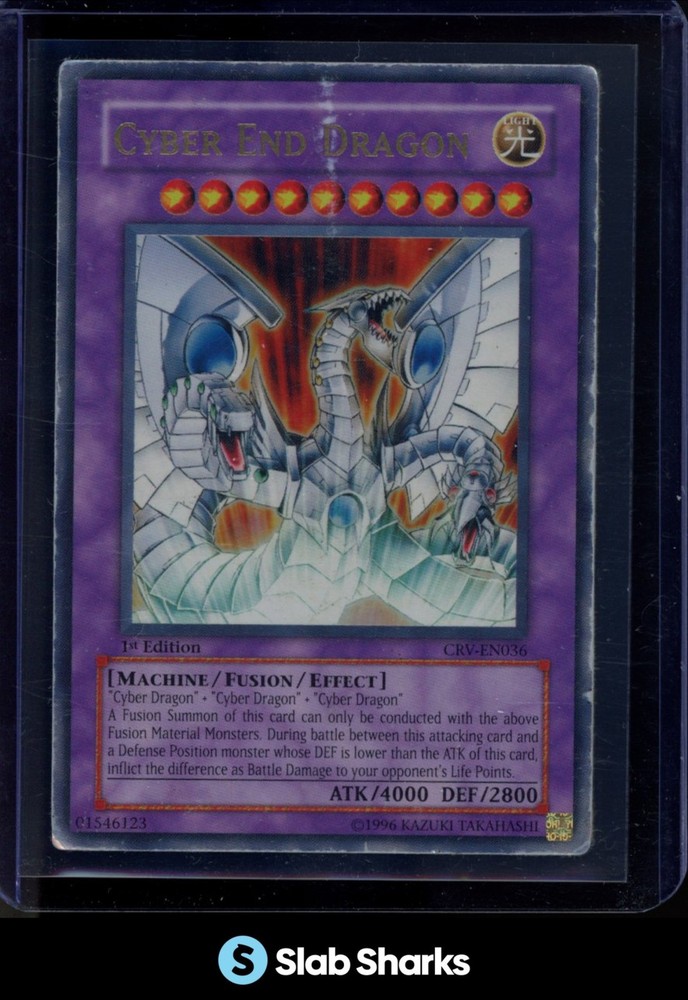 Slab Shark Menu Sports Trading Cards Non-Sport Trading Cards Comic Books & Memorabilia Collectible Card Games ● ● ● 2005 YU-GI-OH! CYBERNETIC REVOLUTION 1ST EDITION #CRV-EN036A CYBER END DRAGON Features: 2005 YU-GI-OH! CYBERNETIC REVOLUTION 1ST EDITION #CRV-EN036A CYBER END DRAGON Your browser does not support HTML5 video. Purchase Terms ---------------- WE SHIP WORLDWIDE DESPITE THE STRIKE. US ORDERS ARE UNAFFECTED - SAME AS PER USUAL. CANADIAN SHIPMENTS UNDER $1000 ARE SHIPPED VIA ALTERNATIVE COURIERS. WE CANNOT SHIP TO PO BOXES IN CANADA (US PO BOX IS UNAFFECTED). ALL ORDERS OVER $1000 ALSO UNAFFECTED TO CANADA, US AND WORLDWIDE --------------- (UNDER $1000): $12.50 + $1 PER ADDITIONAL. TO USA (UNDER $1000): $14.50 + 1 PER ADDITIONAL. TO CANADA VIA UPS w/ FULL INSURANCE (CARDS OVER $1000): $35 + $1 PER ADDITIONAL. TO USA VIA UPS w/ FULL INSURANCE (CARDS OVER $1000): $45 + $1 PER ADDITIONAL ---------------- SLABSHARKS INC. IS ACCEPTING EBAY CONSIGNMENTS FOR CANADIANS. BUYERS HAVE UNTIL TUESDAY 10PM EST TO PAY FOR THEIR ORDER. NO EXCEPTIONS. NO EXCUSES. ORDERS WILL BE AUTO CANCELLED. ---------------- AMERICAN BUYERS - TO DECREASE SHIPPING PRICES ACROSS THE BORDER WE USE AN AMERICAN LOGISTICS COMPANY. WE SHIP THE ITEM ON TUESDAY IN CANADA, BUT TRACKING SCANS ONLY OCCUR WHEN THE ITEM IS IN THE US. THIS MAY BE 3-5 BUSINESS DAYS AFTER TUESDAY. DELIVERY IS EXPECTED WITHIN 2 WEEKS OF SHIPPING. CANADIAN BUYERS - 3000 ~ PACKAGES ARE PROVIDED TO OUR SHIPPING PROVIDERS ON TUESDAY, THE PACKAGES ARE TAKEN BACK TO THE PROCESSING CENTRE AND THEN SCANNED. THIS MAY TAKE 1-3 BUSINESS DAYS TO SEE A SCAN. HOWEVER, THE SHIPPING PROCESS HAS STARTED. ---------------- COMBINED SHIPPING IS AVAILABLE FOR ITEMS IN THE SAME AUCTION. ITEMS ENDING THURSDAY CANNOT BE COMBINED WITH ITEMS ENDING THE FOLLOWING THURSDAY If looking for combined shipping, PLEASE WAIT FOR INVOICES PRIOR TO PAYMENT. INVOICES ARE SENT WITHIN 2 BUSINESS DAYS. WE CANNOT COMBINE INVOICES FOR ORDERS CONTAINING AUTHENTICITY GUARANTEE ITEMS. ---------------- BULK ITEMS INCLUDING FRAMED ITEMS MAY HAVE DIFFERENT RATES LOCAL PICK UP IS TEMPORAIRLY ON HOLD - WE ARE WAITING FOR EBAY TO APPROVE OUR PICK UP POLICY. and product updates. ---------------- THIS LISTING IS FOR THE ITEM TITLED. IF THERE ARE ANY ERRORS WITH THE PICTURE, LET US KNOW ASAP. UNLESS SPECIFICALLY NOTED: ALL CARDS ARE EXCELLENT (*EX*) OR BETTER. RAW CARDS ARE EXPECTED TO BE IN PSA 8 CONDITION OR ABOVE. PLEASE ANALYZE PHOTOS OLDER CARDS MAY HAVE MORE WEAR THAN MODERN CARDS. VINTAGE CARDS ARE NOT EXPECTED TO BE IN GREAT CONDITION - PLEASE DILIGENTLY ASSESS PICTURES, SOME MAY BE IN PSA 1-2 CONDITION. SOME THICK CARDS MAY HAVE MINOR WEAR. WE TRY OUR BEST TO NOTE SCRATCHES/CHIPS ON SLABS BUT PLEASE ASSUME THERE ARE MINOR SCUFFS/SCRATCHES ON EVERY CASE MOST DEFECTS OR DEBRIS ARE DUE TO PARTICLES ON THE SCANNER, HOWEVER, THESE ARE EASILY IDENTIFIABLE, IF YOU THINK SOMETHING MAY BE ON THE CARD - PLEASE ASK PLEASE SEE SCANS AND ASK QUESTIONS RE: THE CONDITION OF THE ITEM. Returns We hope you will love your purchase, however due to the nature of collectibles, we ONLY accept returns within 30 days. IMPORTANT FOR RETURNS: A RESTOCKING FEE OF 25% OF THE FULL PURCHASE PRICE WILL BE DEDUCTED FROM THE REFUND. Shipping Your package will be shipped on the nearest Tuesday before 7PM EST. We ship on Tuesdays to ensure buyers have 5 days to pay before we batch ship every item! For any non-FedEx shipments, your tracking number may take a couple of days to update, as we use a shipment logistics provider! Please give it 3 Business Days before inquiring about tracking updates!