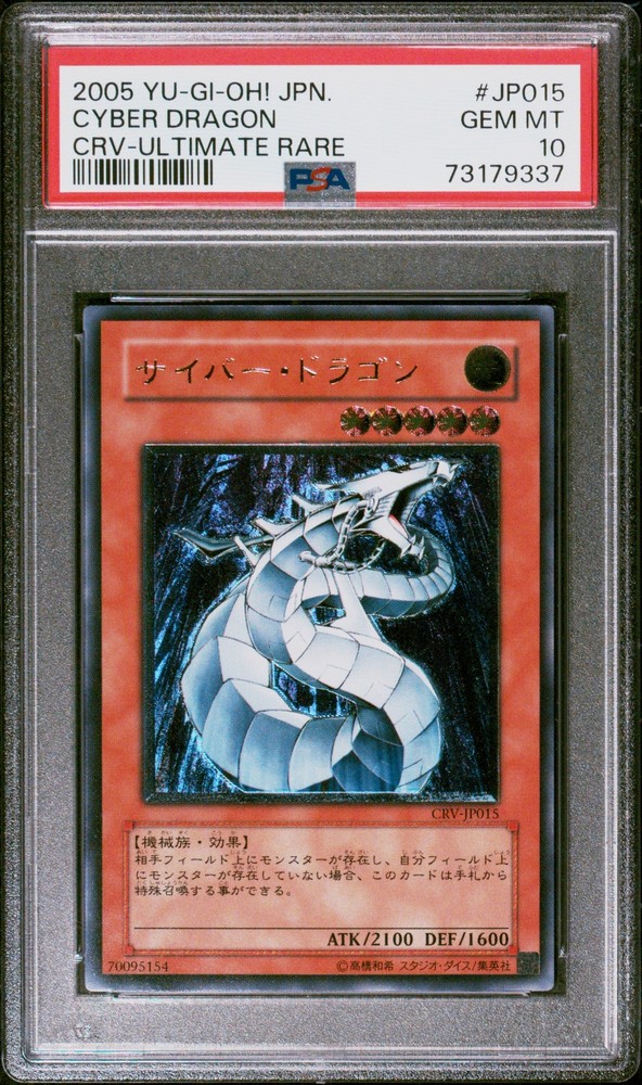 2005 YU-GI-OH! JAPANESE CYBERNETIC REVOLUTION ULTIMATE RARE #JP015 CYBER DRAGON PSA 10 2005 YU-GI-OH! JAPANESE CYBERNETIC REVOLUTION ULTIMATE RARE #JP015 CYBER DRAGON PSA 10 Purchase Info Thank you for your interest in this item consigned with PSA! By purchasing or making an offer on this item, you acknowledge and agree to the following terms: All sales are final. Returns not accepted. Payment must be made upon purchase of the item. All items are sold "as is" and without warranty of Collectors Universe, Inc. (d/b/a PSA), and ANY AND ALL IMPLIED WARRANTIES ARE DISCLAIMED AND EXCLUDED. Sales tax may apply depending on shipping address. PSA does not guarantee that another third-party grading company's authentication or certification of an item as genuine is correct or accurate. Neither a difference of opinion between third-party grading companies about authenticity, nor a company's subsequent reversal of its earlier authentication or certification of an item, will be a basis for rescinding a sale. Any dispute with another third-party grading company relating to the authenticity of an item must be resolved directly with that other company. Collectors' maximum liability in the event of loss or damage to an item during shipping will be the lesser of (a) the price paid for the item and (b) the change in fair market value of the item. You release Collectors from all other liability including for any claims of punitive damages, emotional distress, consequential damages, lost profits, or lost interest, except as prohibited by law. Shipping Purchased Items will be shipped directly from PSA Vault. You stay hands-free. PSA Vault When you purchase this item, you can save on sales tax and selling fees by keeping it in the PSA Vault, official Vault of eBay. Items already in PSA Vault and will be sent to PSA Vault will have no shipping charge Storage of any items with the PSA Vault will be subject to the PSA Vault Terms of Service. Consignment PSA has competitive rates on the world's largest collectibles marketplace with the option to list from the PSA Vault or immediately after PSA authentication and grading. Sale Price Under $100 $100 - $499 $500 - $999 $1,000 - $2,499 $2,500 - $4,999 $5,000+ Seller Fee 16% 14% 13% 10% 9% 7% Sellers pay a single fee as reflected above; no additional eBay fees are incurred. There is a $5 minimum fee on sold items.
