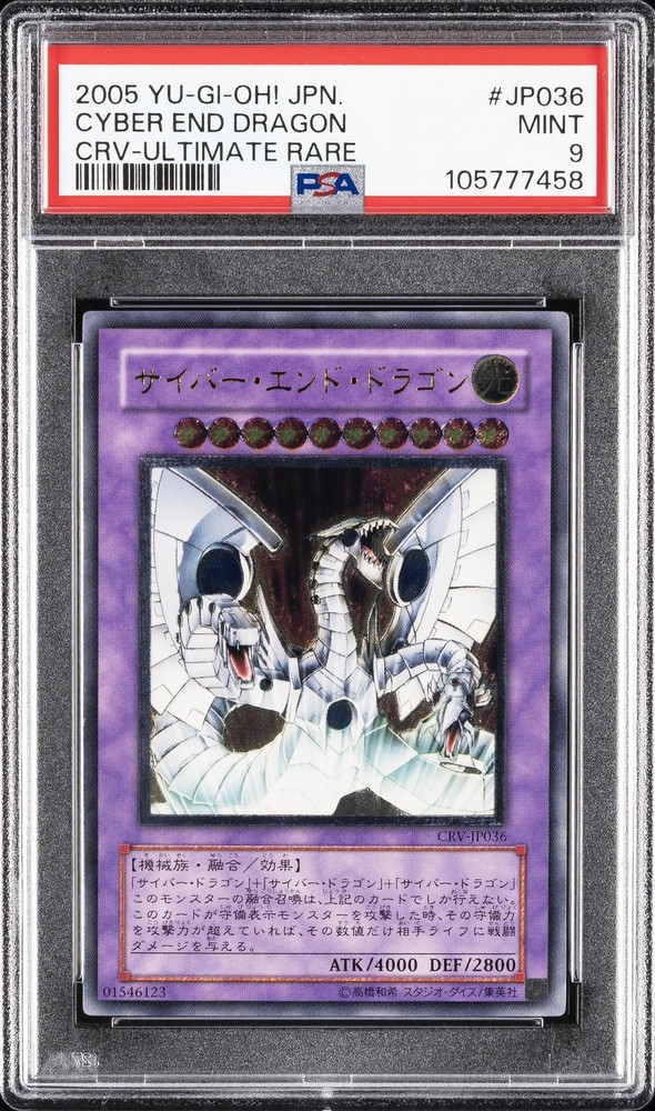 2005 YU-GI-OH! JAPANESE CYBERNETIC REVOLUTION ULTIMATE RARE #JP036 CYBER END DRAGON PSA 9 2005 YU-GI-OH! JAPANESE CYBERNETIC REVOLUTION ULTIMATE RARE #JP036 CYBER END DRAGON PSA 9 Purchase Info Thank you for your interest in this item consigned with PSA! By purchasing or making an offer on this item, you acknowledge and agree to the following terms: All sales are final. Returns not accepted. Payment must be made upon purchase of the item. All items are sold "as is" and without warranty of Collectors Universe, Inc. (d/b/a PSA), and ANY AND ALL IMPLIED WARRANTIES ARE DISCLAIMED AND EXCLUDED. Sales tax may apply depending on shipping address. PSA does not guarantee that another third-party grading company's authentication or certification of an item as genuine is correct or accurate. Neither a difference of opinion between third-party grading companies about authenticity, nor a company's subsequent reversal of its earlier authentication or certification of an item, will be a basis for rescinding a sale. Any dispute with another third-party grading company relating to the authenticity of an item must be resolved directly with that other company. Collectors' maximum liability in the event of loss or damage to an item during shipping will be the lesser of (a) the price paid for the item and (b) the change in fair market value of the item. You release Collectors from all other liability including for any claims of punitive damages, emotional distress, consequential damages, lost profits, or lost interest, except as prohibited by law. Shipping Purchased Items will be shipped directly from PSA Vault. You stay hands-free. PSA Vault When you purchase this item, you can save on sales tax and selling fees by keeping it in the PSA Vault, official Vault of eBay. Items already in PSA Vault and will be sent to PSA Vault will have no shipping charge Storage of any items with the PSA Vault will be subject to the PSA Vault Terms of Service. Consignment PSA has competitive rates on the world's largest collectibles marketplace with the option to list from the PSA Vault or immediately after PSA authentication and grading. Sale Price Under $100 $100 - $499 $500 - $999 $1,000 - $2,499 $2,500 - $4,999 $5,000+ Seller Fee 16% 14% 13% 10% 9% 7% Sellers pay a single fee as reflected above; no additional eBay fees are incurred. There is a $5 minimum fee on sold items.