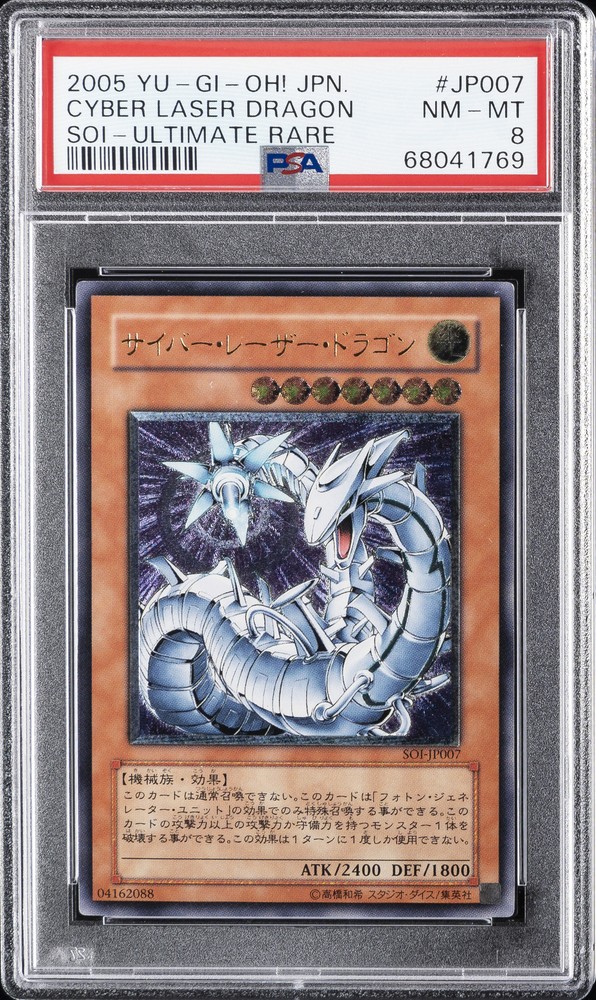 2005 YU-GI-OH! JAPANESE SHADOW OF INFINITY ULTIMATE RARE #JP007 CYBER LASER DRAGON PSA 8 2005 YU-GI-OH! JAPANESE SHADOW OF INFINITY ULTIMATE RARE #JP007 CYBER LASER DRAGON PSA 8 Purchase Info Thank you for your interest in this item consigned with PSA! By purchasing or making an offer on this item, you acknowledge and agree to the following terms: All sales are final. Returns not accepted. Payment must be made upon purchase of the item. All items are sold "as is" and without warranty of Collectors Universe, Inc. (d/b/a PSA), and ANY AND ALL IMPLIED WARRANTIES ARE DISCLAIMED AND EXCLUDED. Sales tax may apply depending on shipping address. PSA does not guarantee that another third-party grading company's authentication or certification of an item as genuine is correct or accurate. Neither a difference of opinion between third-party grading companies about authenticity, nor a company's subsequent reversal of its earlier authentication or certification of an item, will be a basis for rescinding a sale. Any dispute with another third-party grading company relating to the authenticity of an item must be resolved directly with that other company. Collectors' maximum liability in the event of loss or damage to an item during shipping will be the lesser of (a) the price paid for the item and (b) the change in fair market value of the item. You release Collectors from all other liability including for any claims of punitive damages, emotional distress, consequential damages, lost profits, or lost interest, except as prohibited by law. Shipping Purchased Items will be shipped directly from PSA Vault. You stay hands-free. PSA Vault When you purchase this item, you can save on sales tax and selling fees by keeping it in the PSA Vault, official Vault of eBay. Items already in PSA Vault and will be sent to PSA Vault will have no shipping charge Storage of any items with the PSA Vault will be subject to the PSA Vault Terms of Service. Consignment PSA has competitive rates on the world's largest collectibles marketplace with the option to list from the PSA Vault or immediately after PSA authentication and grading. Sale Price Under $100 $100 - $499 $500 - $999 $1,000 - $2,499 $2,500 - $4,999 $5,000+ Seller Fee 16% 14% 13% 10% 9% 7% Sellers pay a single fee as reflected above; no additional eBay fees are incurred. There is a $5 minimum fee on sold items.