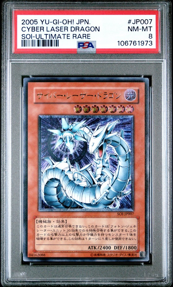 2005 YU-GI-OH! JAPANESE SOI-SHADOW OF INFINITY ULTIMATE RARE #JP007 CYBER LASER DRAGON PSA 8 2005 YU-GI-OH! JAPANESE SOI-SHADOW OF INFINITY ULTIMATE RARE #JP007 CYBER LASER DRAGON PSA 8 Purchase Info Thank you for your interest in this item consigned with PSA! By purchasing or making an offer on this item, you acknowledge and agree to the following terms: All sales are final. Returns not accepted. Payment must be made upon purchase of the item. All items are sold "as is" and without warranty of Collectors Universe, Inc. (d/b/a PSA), and ANY AND ALL IMPLIED WARRANTIES ARE DISCLAIMED AND EXCLUDED. Sales tax may apply depending on shipping address. PSA does not guarantee that another third-party grading company's authentication or certification of an item as genuine is correct or accurate. Neither a difference of opinion between third-party grading companies about authenticity, nor a company's subsequent reversal of its earlier authentication or certification of an item, will be a basis for rescinding a sale. Any dispute with another third-party grading company relating to the authenticity of an item must be resolved directly with that other company. Collectors' maximum liability in the event of loss or damage to an item during shipping will be the lesser of (a) the price paid for the item and (b) the change in fair market value of the item. You release Collectors from all other liability including for any claims of punitive damages, emotional distress, consequential damages, lost profits, or lost interest, except as prohibited by law. Shipping Purchased Items will be shipped directly from PSA Vault. You stay hands-free. PSA Vault When you purchase this item, you can save on sales tax and selling fees by keeping it in the PSA Vault, official Vault of eBay. Items already in PSA Vault and will be sent to PSA Vault will have no shipping charge Storage of any items with the PSA Vault will be subject to the PSA Vault Terms of Service. Consignment PSA has competitive rates on the world's largest collectibles marketplace with the option to list from the PSA Vault or immediately after PSA authentication and grading. Sale Price Under $100 $100 - $499 $500 - $999 $1,000 - $2,499 $2,500 - $4,999 $5,000+ Seller Fee 16% 14% 13% 10% 9% 7% Sellers pay a single fee as reflected above; no additional eBay fees are incurred. There is a $5 minimum fee on sold items.