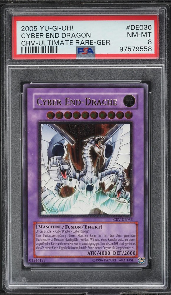 Unleash the power of the Cyber End Dragon with this Ultimate Rare German card from the Cybernetic Revolution set. A must-have for any serious Yu-Gi-Oh! TCG collector, the card's fusion type allows for strategic gameplay, and its rarity ensures it stands out in any collection. The card is professionally graded by PSA with a score of 8, reflecting its excellent state. With the card's language being German, it offers a unique addition for collectors who appreciate international variants. Add this impressive piece to your arsenal and watch your opponents marvel at the might of the Cyber End Dragon.