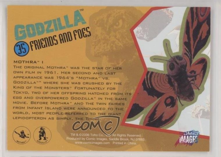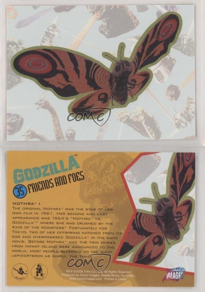 2006 Comic Images Godzilla: King of the Monsters - [Base] #35 Friends And Foes - Mothra I COMC Item: 105452231 - Non-Sports Card Search for more: 2006 Comic Images Godzilla: King of the Monsters Search for more: 2006 Comic Images Godzilla: King of the Monsters - [Base] View all of our Listings Auctions Buy It Now About Us Located in the beautiful Pacific Northwest, COMC (Check Out My Cards) is the world's largest consignment service for trading card singles. More than 10,000 people have used our consignment service to list over 50 million trading cards. Find out how we can help you consign your items on eBay by contacting us through eBay messaging. COMC -- "The Safe & Easy Way to Buy & Sell" Raw Condition for Modern Cards Unless otherwise noted, raw modern cards are listed in Near Mint-Mint condition or better. A NM-MT card appears to be Mint at first glance, but upon closer inspection, may exhibit some of the following: minor print defects (e.g. roller marks, print line, dimple), minor scratches, slight edge wear, and slight corner wear. Centering is clearly visible in the images provided and does not factor into our condition assessment. Raw Condition for Vintage Cards Unless otherwise noted, raw vintage cards are listed in Excellent condition or better. An EX card may exhibit some of the following: minor rounding of corners, surface wear, print defects, light scratches, and slight edge wear/chipping. Centering is clearly visible in the images provided and does not factor into our condition assessment. Domestic Shipping Combined shipping for multiple items is available. To receive combined shipping, please ensure all desired items are in your eBay shopping cart before proceeding to checkout. eBay limits orders to 40 items per order. We automatically combine multiple orders placed on the same day. If you place multiple orders on the same day, please contact us to request a refund of applicable shipping costs. Signature confirmation may be required on invoices over $400. All cards are protected and shipped securely. International Shipping COMC offers eBay's International Shipping (EIS) for international orders under $2,500* (see country exceptions below). All duties and import fees are paid at checkout; in the rare event that there are additional import fees upon delivery, these are borne by the buyer. EIS packages route through a shipping hub in Erlanger, KY before shipping to their final destination. Please note that EIS does not allow for combined shipments. The shipping rates are determined by eBay and cannot be adjusted. *Maximum sale price exceptions: Colombia, Kuwait ($2,000); Taiwan ($1,539); Chile, Costa Rica, Guatemala, Honduras, Trinidad and Tobago ($1,000); Antigua and Barbuda, Aruba, Belize, Dominica, Grenada, Philippines, Saint Kitts and Nevis, Saint Lucia, Montserrat, Turks and Caicos Islands ($500); Dominican Republic, El Salvador ($200). Please request a shipping quote through eBay messaging for orders that exceed the maximum sale price supported by eBay's International Shipping. You will be responsible for all duties and import fees for international orders shipped outside the EIS. All cards are protected and shipped securely. Payment COMC does not accept offers on our cards through our eBay storefront. COMC utilizes eBay’s managed payments system. If you are experiencing difficulties making a payment, please contact eBay for assistance. Return Policy Returns are only accepted on the rare occasion the item is not as described. If you are making a return, please initiate the return process through eBay so a mailing label can be provided for you. Prior to listing, our expert team carefully assessed this item to represent it accurately. Please review the description and high-definition images prior to purchasing to ensure this item meets your satisfaction. We welcome you to contact us if you have further questions about this item. Trust and Integrity COMC carefully assesses each item consigned to us to prevent fraudulent items from entering the marketplace. If you believe an item offered on COMC may be fraudulent, please contact us with details so we can investigate the issue. Items we determine are outside our supported items policy may be removed. Last Modified: 6/8/2025 10:28:29 PM PDT