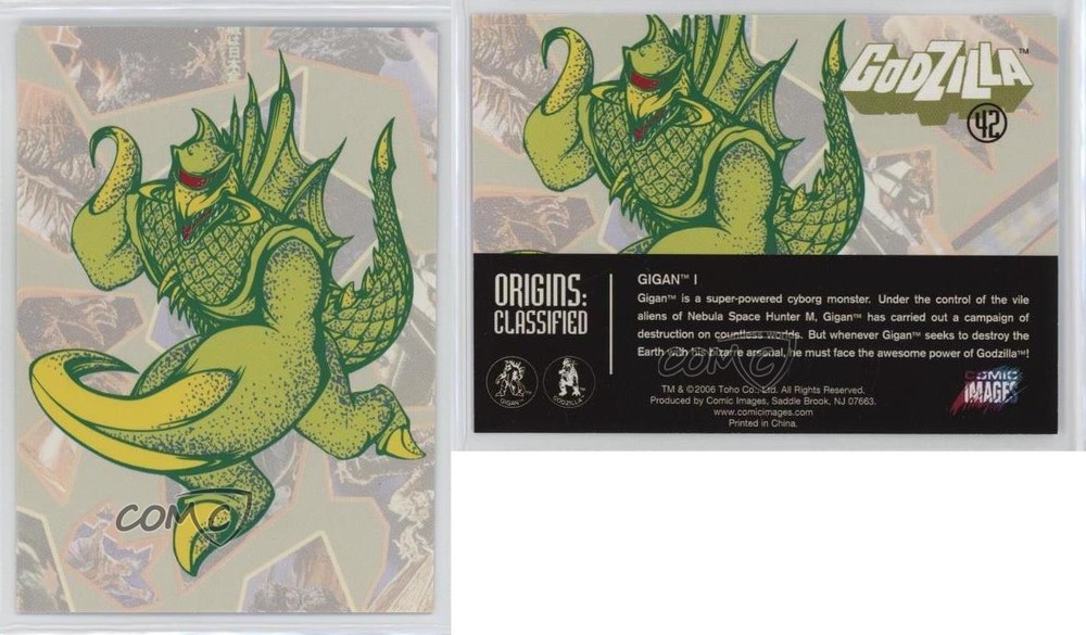 2006 Comic Images Godzilla: King of the Monsters - [Base] #42 Origins: Classified - Gigan COMC Item: 255862157 - Non-Sports Card - Featuring Gigan Search for more: 2006 Comic Images Godzilla: King of the Monsters Search for more: 2006 Comic Images Godzilla: King of the Monsters - [Base] View all of our Listings Auctions Buy It Now About Us Located in the beautiful Pacific Northwest, COMC (Check Out My Cards) is the world's largest consignment service for trading card singles. More than 10,000 people have used our consignment service to list over 50 million trading cards. Find out how we can help you consign your items on eBay by contacting us through eBay messaging. COMC -- "The Safe & Easy Way to Buy & Sell" Raw Condition for Modern Cards Unless otherwise noted, raw modern cards are listed in Near Mint-Mint condition or better. A NM-MT card appears to be Mint at first glance, but upon closer inspection, may exhibit some of the following: minor print defects (e.g. roller marks, print line, dimple), minor scratches, slight edge wear, and slight corner wear. Centering is clearly visible in the images provided and does not factor into our condition assessment. Raw Condition for Vintage Cards Unless otherwise noted, raw vintage cards are listed in Excellent condition or better. An EX card may exhibit some of the following: minor rounding of corners, surface wear, print defects, light scratches, and slight edge wear/chipping. Centering is clearly visible in the images provided and does not factor into our condition assessment. Domestic Shipping Combined shipping for multiple items is available. To receive combined shipping, please ensure all desired items are in your eBay shopping cart before proceeding to checkout. eBay limits orders to 40 items per order. We automatically combine multiple orders placed on the same day. If you place multiple orders on the same day, please contact us to request a refund of applicable shipping costs. Signature confirmation may be required on invoices over $400. All cards are protected and shipped securely. International Shipping COMC offers eBay's International Shipping (EIS) for international orders under $2,500* (see country exceptions below). All duties and import fees are paid at checkout; in the rare event that there are additional import fees upon delivery, these are borne by the buyer. EIS packages route through a shipping hub in Erlanger, KY before shipping to their final destination. Please note that EIS does not allow for combined shipments. The shipping rates are determined by eBay and cannot be adjusted. *Maximum sale price exceptions: Colombia, Kuwait ($2,000); Taiwan ($1,539); Chile, Costa Rica, Guatemala, Honduras, Trinidad and Tobago ($1,000); Antigua and Barbuda, Aruba, Belize, Dominica, Grenada, Philippines, Saint Kitts and Nevis, Saint Lucia, Montserrat, Turks and Caicos Islands ($500); Dominican Republic, El Salvador ($200). Please request a shipping quote through eBay messaging for orders that exceed the maximum sale price supported by eBay's International Shipping. You will be responsible for all duties and import fees for international orders shipped outside the EIS. All cards are protected and shipped securely. Payment COMC does not accept offers on our cards through our eBay storefront. COMC utilizes eBay’s managed payments system. If you are experiencing difficulties making a payment, please contact eBay for assistance. Return Policy Returns are only accepted on the rare occasion the item is not as described. If you are making a return, please initiate the return process through eBay so a mailing label can be provided for you. Prior to listing, our expert team carefully assessed this item to represent it accurately. Please review the description and high-definition images prior to purchasing to ensure this item meets your satisfaction. We welcome you to contact us if you have further questions about this item. Trust and Integrity COMC carefully assesses each item consigned to us to prevent fraudulent items from entering the marketplace. If you believe an item offered on COMC may be fraudulent, please contact us with details so we can investigate the issue. Items we determine are outside our supported items policy may be removed. Last Modified: 5/7/2025 6:04:44 AM PDT