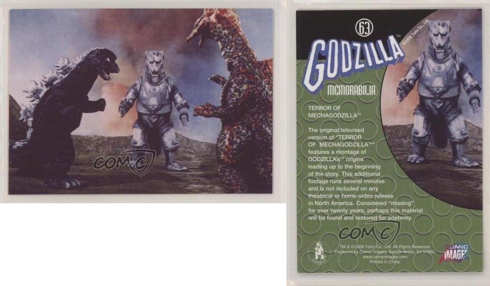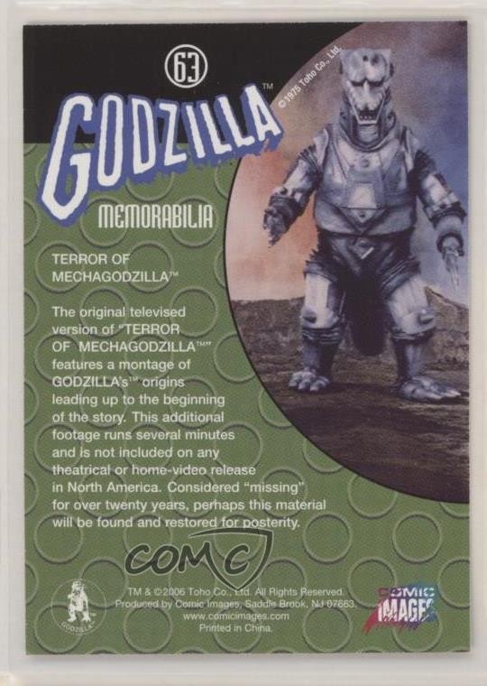 2006 Comic Images Godzilla: King of the Monsters - [Base] #63 Memorabilia - Terror of Mechagodzilla COMC Item: 106111559 - Non-Sports Card Search for more: 2006 Comic Images Godzilla: King of the Monsters Search for more: 2006 Comic Images Godzilla: King of the Monsters - [Base] View all of our Listings Auctions Buy It Now About Us Located in the beautiful Pacific Northwest, COMC (Check Out My Cards) is the world's largest consignment service for trading card singles. More than 10,000 people have used our consignment service to list over 50 million trading cards. Find out how we can help you consign your items on eBay by contacting us through eBay messaging. COMC -- "The Safe & Easy Way to Buy & Sell" Raw Condition for Modern Cards Unless otherwise noted, raw modern cards are listed in Near Mint-Mint condition or better. A NM-MT card appears to be Mint at first glance, but upon closer inspection, may exhibit some of the following: minor print defects (e.g. roller marks, print line, dimple), minor scratches, slight edge wear, and slight corner wear. Centering is clearly visible in the images provided and does not factor into our condition assessment. Raw Condition for Vintage Cards Unless otherwise noted, raw vintage cards are listed in Excellent condition or better. An EX card may exhibit some of the following: minor rounding of corners, surface wear, print defects, light scratches, and slight edge wear/chipping. Centering is clearly visible in the images provided and does not factor into our condition assessment. Domestic Shipping Combined shipping for multiple items is available. To receive combined shipping, please ensure all desired items are in your eBay shopping cart before proceeding to checkout. eBay limits orders to 40 items per order. We automatically combine multiple orders placed on the same day. If you place multiple orders on the same day, please contact us to request a refund of applicable shipping costs. Signature confirmation may be required on invoices over $400. All cards are protected and shipped securely. International Shipping COMC offers eBay's International Shipping (EIS) for international orders under $2,500* (see country exceptions below). All duties and import fees are paid at checkout; in the rare event that there are additional import fees upon delivery, these are borne by the buyer. EIS packages route through a shipping hub in Erlanger, KY before shipping to their final destination. Please note that EIS does not allow for combined shipments. The shipping rates are determined by eBay and cannot be adjusted. *Maximum sale price exceptions: Colombia, Kuwait ($2,000); Taiwan ($1,539); Chile, Costa Rica, Guatemala, Honduras, Trinidad and Tobago ($1,000); Antigua and Barbuda, Aruba, Belize, Dominica, Grenada, Philippines, Saint Kitts and Nevis, Saint Lucia, Montserrat, Turks and Caicos Islands ($500); Dominican Republic, El Salvador ($200). Please request a shipping quote through eBay messaging for orders that exceed the maximum sale price supported by eBay's International Shipping. You will be responsible for all duties and import fees for international orders shipped outside the EIS. All cards are protected and shipped securely. Payment COMC does not accept offers on our cards through our eBay storefront. COMC utilizes eBay’s managed payments system. If you are experiencing difficulties making a payment, please contact eBay for assistance. Return Policy Returns are only accepted on the rare occasion the item is not as described. If you are making a return, please initiate the return process through eBay so a mailing label can be provided for you. Prior to listing, our expert team carefully assessed this item to represent it accurately. Please review the description and high-definition images prior to purchasing to ensure this item meets your satisfaction. We welcome you to contact us if you have further questions about this item. Trust and Integrity COMC carefully assesses each item consigned to us to prevent fraudulent items from entering the marketplace. If you believe an item offered on COMC may be fraudulent, please contact us with details so we can investigate the issue. Items we determine are outside our supported items policy may be removed. Last Modified: 6/6/2025 6:59:55 PM PDT