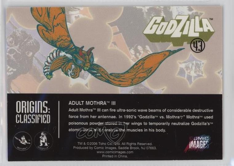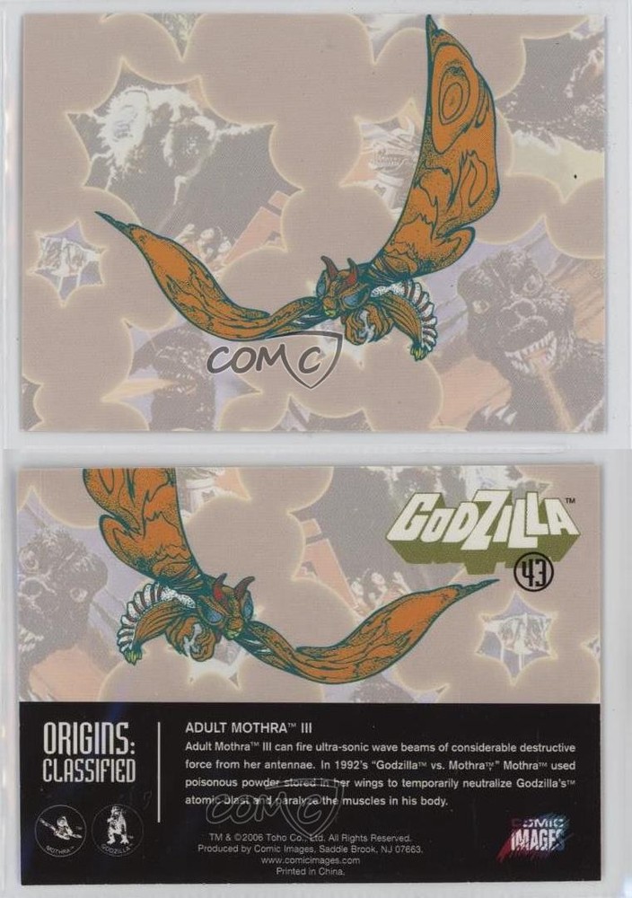 2006 Comic Images Godzilla: King of the Monsters - [Base] #43 Origins: Classified - Adult Mothra COMC Item: 254054212 - Non-Sports Card - Featuring Mothra Search for more: 2006 Comic Images Godzilla: King of the Monsters Search for more: 2006 Comic Images Godzilla: King of the Monsters - [Base] View all of our Listings Auctions Buy It Now About Us Located in the beautiful Pacific Northwest, COMC (Check Out My Cards) is the world's largest consignment service for trading card singles. More than 10,000 people have used our consignment service to list over 50 million trading cards. Find out how we can help you consign your items on eBay by contacting us through eBay messaging. COMC -- "The Safe & Easy Way to Buy & Sell" Raw Condition for Modern Cards Unless otherwise noted, raw modern cards are listed in Near Mint-Mint condition or better. A NM-MT card appears to be Mint at first glance, but upon closer inspection, may exhibit some of the following: minor print defects (e.g. roller marks, print line, dimple), minor scratches, slight edge wear, and slight corner wear. Centering is clearly visible in the images provided and does not factor into our condition assessment. Raw Condition for Vintage Cards Unless otherwise noted, raw vintage cards are listed in Excellent condition or better. An EX card may exhibit some of the following: minor rounding of corners, surface wear, print defects, light scratches, and slight edge wear/chipping. Centering is clearly visible in the images provided and does not factor into our condition assessment. Domestic Shipping Combined shipping for multiple items is available. To receive combined shipping, please ensure all desired items are in your eBay shopping cart before proceeding to checkout. eBay limits orders to 40 items per order. We automatically combine multiple orders placed on the same day. If you place multiple orders on the same day, please contact us to request a refund of applicable shipping costs. Signature confirmation may be required on invoices over $400. All cards are protected and shipped securely. International Shipping COMC offers eBay's International Shipping (EIS) for international orders under $2,500* (see country exceptions below). All duties and import fees are paid at checkout; in the rare event that there are additional import fees upon delivery, these are borne by the buyer. EIS packages route through a shipping hub in Erlanger, KY before shipping to their final destination. Please note that EIS does not allow for combined shipments. The shipping rates are determined by eBay and cannot be adjusted. *Maximum sale price exceptions: Colombia, Kuwait ($2,000); Taiwan ($1,539); Chile, Costa Rica, Guatemala, Honduras, Trinidad and Tobago ($1,000); Antigua and Barbuda, Aruba, Belize, Dominica, Grenada, Philippines, Saint Kitts and Nevis, Saint Lucia, Montserrat, Turks and Caicos Islands ($500); Dominican Republic, El Salvador ($200). Please request a shipping quote through eBay messaging for orders that exceed the maximum sale price supported by eBay's International Shipping. You will be responsible for all duties and import fees for international orders shipped outside the EIS. All cards are protected and shipped securely. Payment COMC does not accept offers on our cards through our eBay storefront. COMC utilizes eBay’s managed payments system. If you are experiencing difficulties making a payment, please contact eBay for assistance. Return Policy Returns are only accepted on the rare occasion the item is not as described. If you are making a return, please initiate the return process through eBay so a mailing label can be provided for you. Prior to listing, our expert team carefully assessed this item to represent it accurately. Please review the description and high-definition images prior to purchasing to ensure this item meets your satisfaction. We welcome you to contact us if you have further questions about this item. Trust and Integrity COMC carefully assesses each item consigned to us to prevent fraudulent items from entering the marketplace. If you believe an item offered on COMC may be fraudulent, please contact us with details so we can investigate the issue. Items we determine are outside our supported items policy may be removed. Last Modified: 7/1/2025 3:42:39 PM PDT