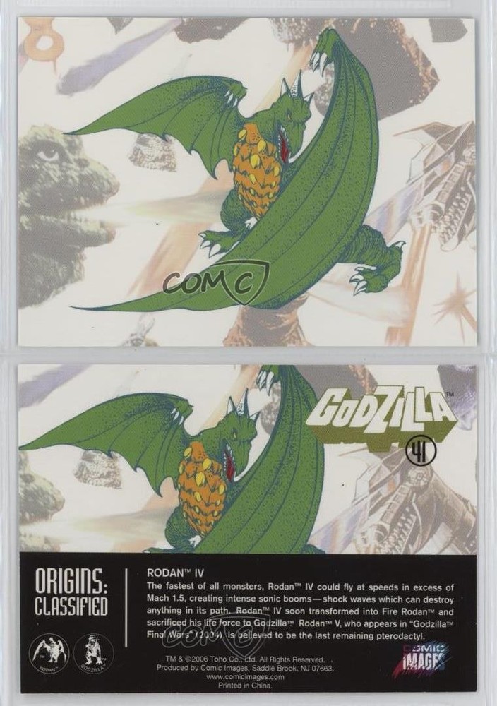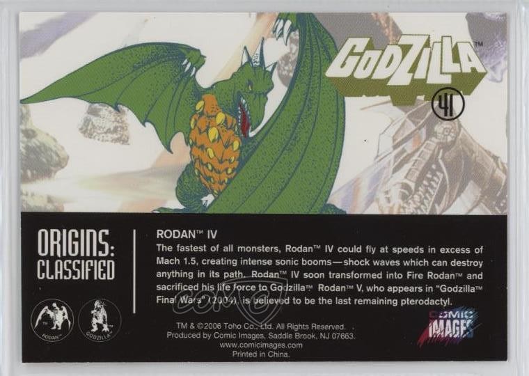 2006 Comic Images Godzilla: King of the Monsters - [Base] #41 Origins: Classified - Rodan IV COMC Item: 257350287 - Non-Sports Card Search for more: 2006 Comic Images Godzilla: King of the Monsters Search for more: 2006 Comic Images Godzilla: King of the Monsters - [Base] View all of our Listings Auctions Buy It Now About Us Located in the beautiful Pacific Northwest, COMC (Check Out My Cards) is the world's largest consignment service for trading card singles. More than 10,000 people have used our consignment service to list over 50 million trading cards. Find out how we can help you consign your items on eBay by contacting us through eBay messaging. COMC -- "The Safe & Easy Way to Buy & Sell" Raw Condition for Modern Cards Unless otherwise noted, raw modern cards are listed in Near Mint-Mint condition or better. A NM-MT card appears to be Mint at first glance, but upon closer inspection, may exhibit some of the following: minor print defects (e.g. roller marks, print line, dimple), minor scratches, slight edge wear, and slight corner wear. Centering is clearly visible in the images provided and does not factor into our condition assessment. Raw Condition for Vintage Cards Unless otherwise noted, raw vintage cards are listed in Excellent condition or better. An EX card may exhibit some of the following: minor rounding of corners, surface wear, print defects, light scratches, and slight edge wear/chipping. Centering is clearly visible in the images provided and does not factor into our condition assessment. Domestic Shipping Combined shipping for multiple items is available. To receive combined shipping, please ensure all desired items are in your eBay shopping cart before proceeding to checkout. eBay limits orders to 40 items per order. We automatically combine multiple orders placed on the same day. If you place multiple orders on the same day, please contact us to request a refund of applicable shipping costs. Signature confirmation may be required on invoices over $400. All cards are protected and shipped securely. International Shipping COMC offers eBay's International Shipping (EIS) for international orders under $2,500* (see country exceptions below). All duties and import fees are paid at checkout; in the rare event that there are additional import fees upon delivery, these are borne by the buyer. EIS packages route through a shipping hub in Erlanger, KY before shipping to their final destination. Please note that EIS does not allow for combined shipments. The shipping rates are determined by eBay and cannot be adjusted. *Maximum sale price exceptions: Colombia, Kuwait ($2,000); Taiwan ($1,539); Chile, Costa Rica, Guatemala, Honduras, Trinidad and Tobago ($1,000); Antigua and Barbuda, Aruba, Belize, Dominica, Grenada, Philippines, Saint Kitts and Nevis, Saint Lucia, Montserrat, Turks and Caicos Islands ($500); Dominican Republic, El Salvador ($200). Please request a shipping quote through eBay messaging for orders that exceed the maximum sale price supported by eBay's International Shipping. You will be responsible for all duties and import fees for international orders shipped outside the EIS. All cards are protected and shipped securely. Payment COMC does not accept offers on our cards through our eBay storefront. COMC utilizes eBay’s managed payments system. If you are experiencing difficulties making a payment, please contact eBay for assistance. Return Policy Returns are only accepted on the rare occasion the item is not as described. If you are making a return, please initiate the return process through eBay so a mailing label can be provided for you. Prior to listing, our expert team carefully assessed this item to represent it accurately. Please review the description and high-definition images prior to purchasing to ensure this item meets your satisfaction. We welcome you to contact us if you have further questions about this item. Trust and Integrity COMC carefully assesses each item consigned to us to prevent fraudulent items from entering the marketplace. If you believe an item offered on COMC may be fraudulent, please contact us with details so we can investigate the issue. Items we determine are outside our supported items policy may be removed. Last Modified: 6/9/2025 1:14:20 AM PDT