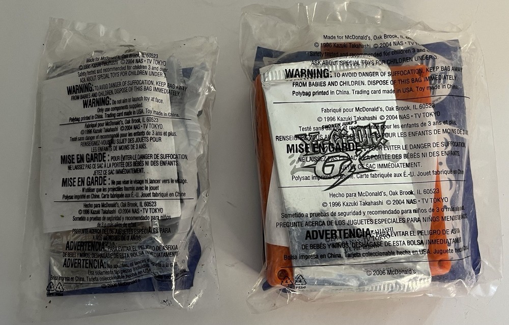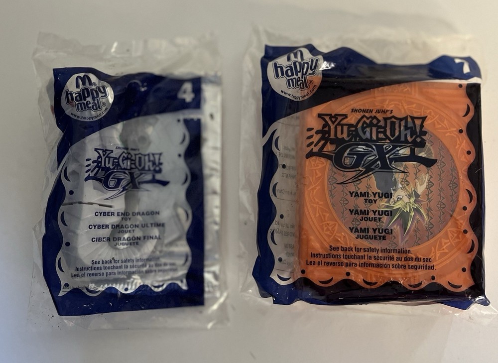 This includes 2 McDonald Happy Meal toys from 2006. They are Yu-Gi-Oh and include #4 Cyber End Dragon and #7 Yami Yugi. They are unopened in the package and comes from a smoke free home.