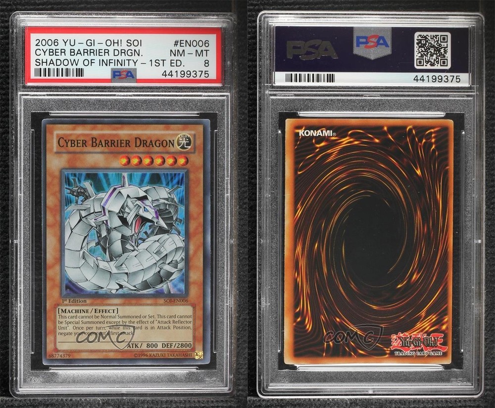 2006 Yu-Gi-Oh! - Shadow of Infinity - [Base] - 1st Edition #SOI-EN006 Cyber Barrier Dragon Graded PSA 8 NM-MT COMC Item: 110664006 - YuGiOh Card - Featuring Cyber Barrier Dragon Search for more: 2006 Yu-Gi-Oh! - Shadow of Infinity Search for more: 2006 Yu-Gi-Oh! - Shadow of Infinity - [Base] - 1st Edition View all of our Listings Auctions Buy It Now About Us Located in the beautiful Pacific Northwest, COMC (Check Out My Cards) is the world's largest consignment service for trading card singles. More than 10,000 people have used our consignment service to list over 50 million trading cards. Find out how we can help you consign your items on eBay by contacting us through eBay messaging. COMC -- "The Safe & Easy Way to Buy & Sell" Raw Condition for Modern Cards Unless otherwise noted, raw modern cards are listed in Near Mint-Mint condition or better. A NM-MT card appears to be Mint at first glance, but upon closer inspection, may exhibit some of the following: minor print defects (e.g. roller marks, print line, dimple), minor scratches, slight edge wear, and slight corner wear. Centering is clearly visible in the images provided and does not factor into our condition assessment. Raw Condition for Vintage Cards Unless otherwise noted, raw vintage cards are listed in Excellent condition or better. An EX card may exhibit some of the following: minor rounding of corners, surface wear, print defects, light scratches, and slight edge wear/chipping. Centering is clearly visible in the images provided and does not factor into our condition assessment. Domestic Shipping Combined shipping for multiple items is available. To receive combined shipping, please ensure all desired items are in your eBay shopping cart before proceeding to checkout. eBay limits orders to 40 items per order. We automatically combine multiple orders placed on the same day. If you place multiple orders on the same day, please contact us to request a refund of applicable shipping costs. Signature confirmation may be required on invoices over $400. All cards are protected and shipped securely. International Shipping COMC offers eBay's International Shipping (EIS) for international orders under $2,500* (see country exceptions below). All duties and import fees are paid at checkout; in the rare event that there are additional import fees upon delivery, these are borne by the buyer. EIS packages route through a shipping hub in Erlanger, KY before shipping to their final destination. Please note that EIS does not allow for combined shipments. The shipping rates are determined by eBay and cannot be adjusted. *Maximum sale price exceptions: Colombia, Kuwait ($2,000); Taiwan ($1,539); Chile, Costa Rica, Guatemala, Honduras, Trinidad and Tobago ($1,000); Antigua and Barbuda, Aruba, Belize, Dominica, Grenada, Philippines, Saint Kitts and Nevis, Saint Lucia, Montserrat, Turks and Caicos Islands ($500); Dominican Republic, El Salvador ($200). Please request a shipping quote through eBay messaging for orders that exceed the maximum sale price supported by eBay's International Shipping. You will be responsible for all duties and import fees for international orders shipped outside the EIS. All cards are protected and shipped securely. Payment COMC does not accept offers on our cards through our eBay storefront. COMC utilizes eBay’s managed payments system. If you are experiencing difficulties making a payment, please contact eBay for assistance. Return Policy Returns are only accepted on the rare occasion the item is not as described. If you are making a return, please initiate the return process through eBay so a mailing label can be provided for you. Prior to listing, our expert team carefully assessed this item to represent it accurately. Please review the description and high-definition images prior to purchasing to ensure this item meets your satisfaction. We welcome you to contact us if you have further questions about this item. Trust and Integrity COMC carefully assesses each item consigned to us to prevent fraudulent items from entering the marketplace. If you believe an item offered on COMC may be fraudulent, please contact us with details so we can investigate the issue. Items we determine are outside our supported items policy may be removed. Last Modified: 6/12/2025 10:10:05 AM PDT