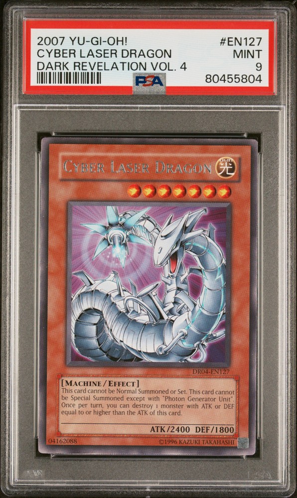 Description Condition: PSA 9 MINT Availability: In Stock You are Purchasing 2007 YUGIOH DR04-EN126 CYBER BARRIER DRAGON RARE PSA 9 MINT #80455804 Professionally graded by Professional Sports Authenticator (PSA) 9 MINT Please review photos before bidding/buying, thank you. MORE GRADED YUGIOH CARDS Payment Options Payment is expected within 2 weeks of your purchase date. We accept all forms of payments through Paypal. Shipping and Handling We ship to all U.S. states, U.S. territories, APO/FPO locations and any international countries listed under our "ship to" heading. Shipping and Handling is calculated based on the combined shipping weight of your item(s). Please use the shipping calculator to estimate your shipping and handling charges. In order to qualify for combined shipping terms, all items must be paid for in one payment; please do not pay until you are done bidding/shopping. Please contact us if you have any questions regarding our shipping and handling terms. Shipping and Delivery Packages are shipped out every Monday, Wednesday, and Friday. Domestic Packages take approximately 2-7 days to arrive. International packages may take a little longer to arrive, typically 1-4 weeks. Please allow ample transit times before inquiring about your package, thank you. Sales Tax All orders shipped to a California address will be subject to Sales Tax. Sales Tax is calculated on the item's price and is not applied to the shipping or other charges. Customer Service We will make every effort to get your purchase is mailed in a timely manner. Please contact us if you have any questions or concerns; we would love to hear any suggestions you have on how we can improve your eBay experience. Thank you for visiting us today.