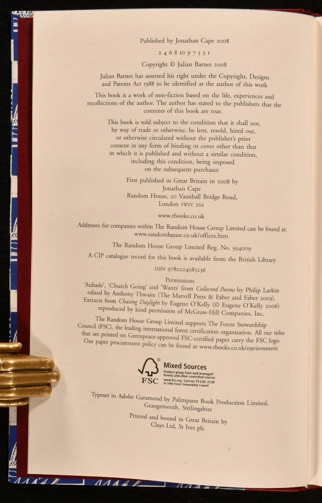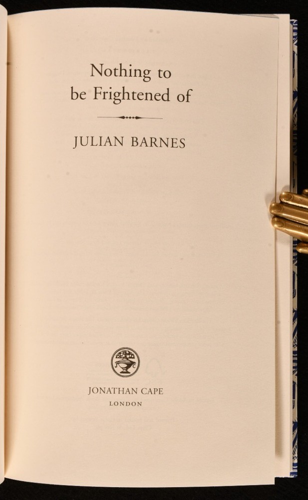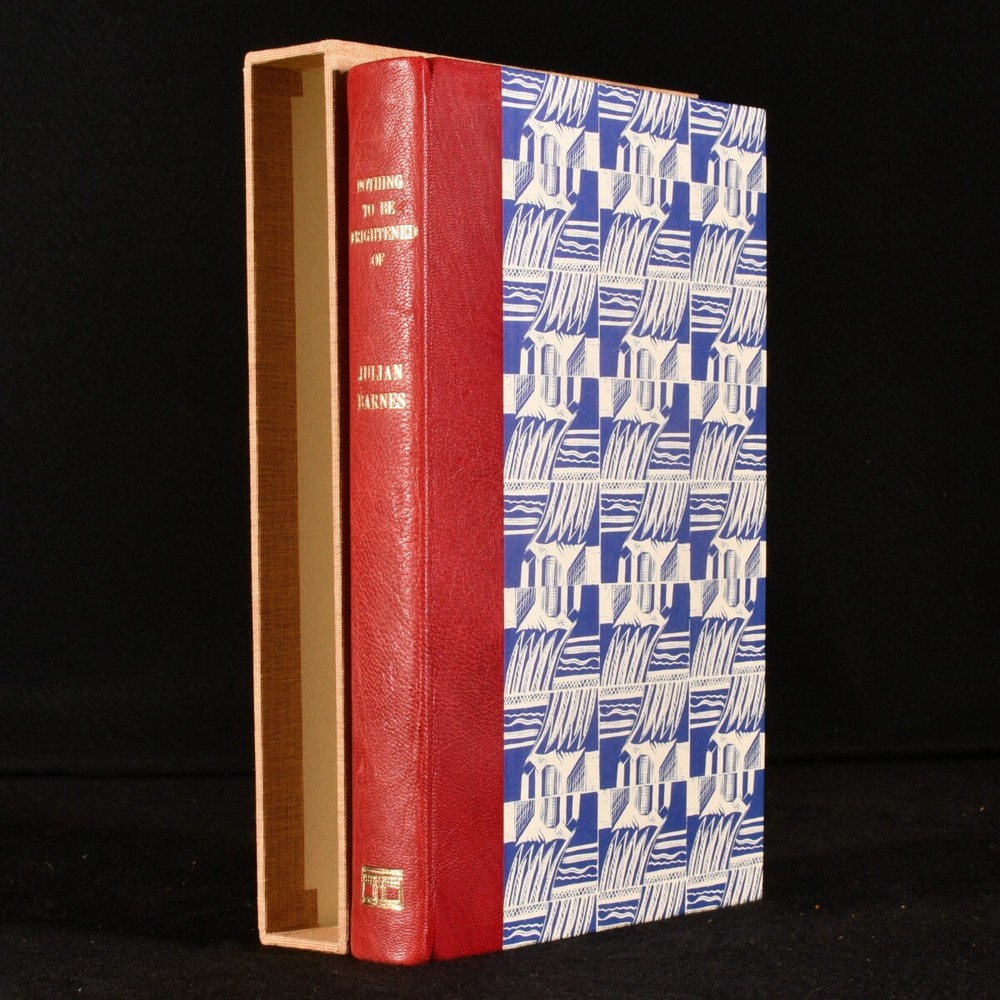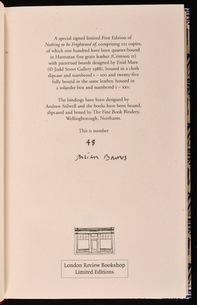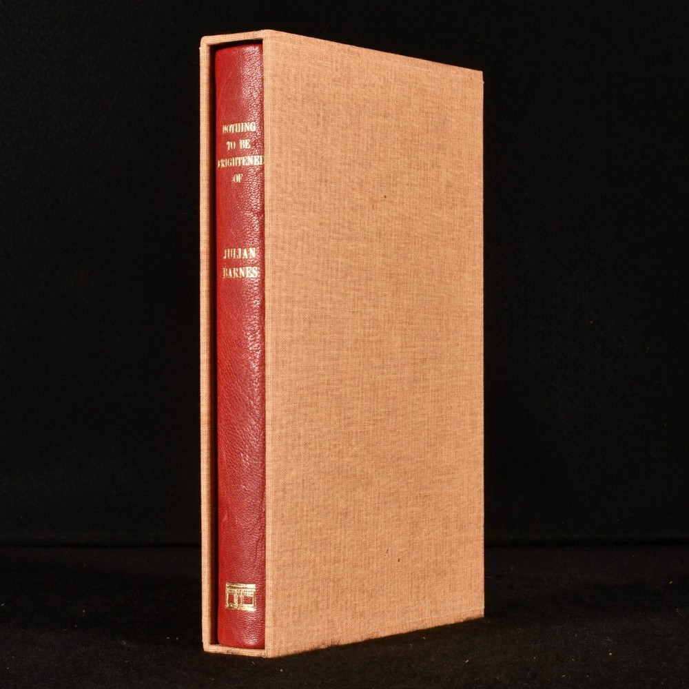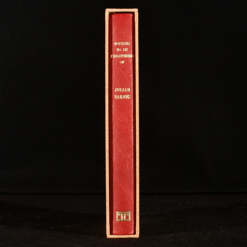 Click here to see our other books! Nothing to be Frightened Of Julian Barnes 2008 Jonathan Cape : London 9" by 6" [8], 250pp SUMMARY The first limited edition of this memoir by Julian Barnes, bound in quarter morocco with a slipcase, and signed by the author. First Edition,Leather Binding,Limited Edition,Publishers' Original Binding,Signed Overall Condition: Fine This book weighs 0.5 KG when packed UK Postage: £ 3.99 US Postage: £ 15.99 EU Postage : £ 13.99 European Postage: £ 14.99 Asia Postage: £ 18.99 Worldwide Postage: £ 19.99 DESCRIPTION The first limited edition of Nothing to be Frightened Of by Julian Barnes in the original publishers quarter morocco binding and paper wrapped boards and the original slipcase. Limited to one hundred and twenty five copies, of which one hundred have been bound in quarter leather. This is issue number forty eight. Signed by the author to the limitation page. This lovely and interesting memoir is supposedly not the author's autobiography, but rather a family exchange and commentary on religion and philosophy. CONDITION In the original publisher's quarter morocco binding with paper wrapped boards and the original cloth slipcase. Externally, excellent. The slipcase is fine. The binding is fine. Internally, firmly bound. The pages are very bright and clean. Overall Condition: Fine GLOSSARY OF TERMS Overall Condition (Dustwrapper condition rating is shown after that for the book itself, where a dustwrapper is present) Fine - Very well preserved copy showing very little wear Very Good Indeed - Only one or two minor faults, really a very attractive copy Very Good - Quite a wide term meaning no major faults but probably several smaller ones often expected given the age of the book, but still a respectable copy Good - Meaning not very good. Some more serious faults as will be described in the condition report under 'condition' Good Only - Meaning one or more faults that could really do with repair Fair - As with good only above but with other faults leaving a compromised copy even after repair Poor - Really bad and possibly seriously incomplete. We only sell books in this condition where their rarity or value makes them attractive none the less. Major defects will be described. GUARANTEE We offer a full money back guarantee on our descriptions. Please ask for details and conditions. We prefer PAYPAL. If you pay via PAYPAL we will post the item off the same or the next working day with the postage you have selected. Please note we cannot accept USD cheques