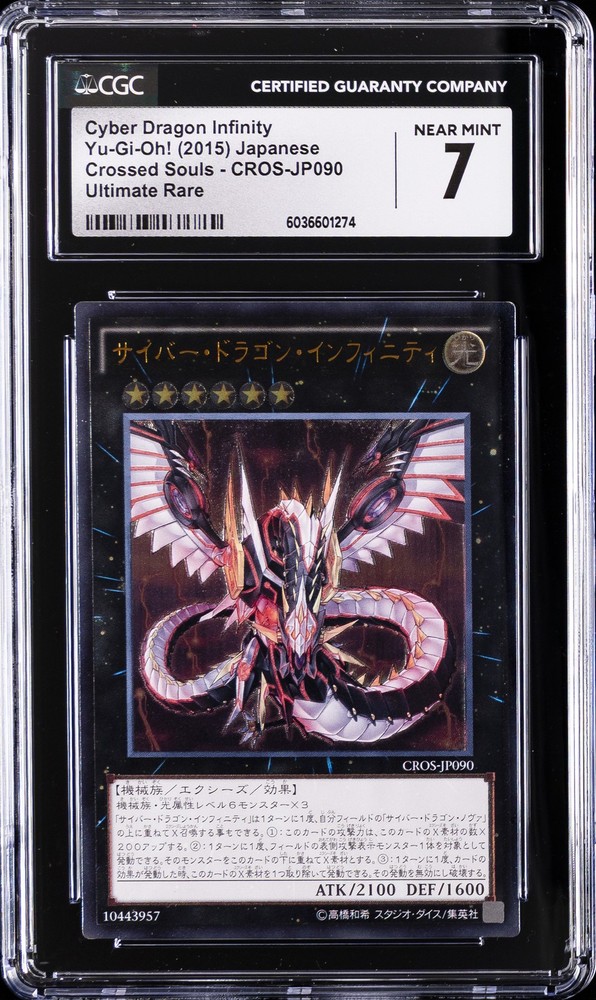 2015 YU-GI-OH! JAPANESE CROSSED SOULS - ULTIMATE RARE #CROS-JP090 CYBER DRAGON INFINITY CGC 7 2015 YU-GI-OH! JAPANESE CROSSED SOULS - ULTIMATE RARE #CROS-JP090 CYBER DRAGON INFINITY CGC 7 Purchase Info Thank you for your interest in bidding on this item consigned with PSA! By bidding on this item, you acknowledge and agree to the following terms: All sales are final. Returns not accepted. Payment must be made within 7 days of auction close. All items are sold "as is" and without warranty of Collectors Universe, Inc. (d/b/a PSA), and ANY AND ALL IMPLIED WARRANTIES ARE DISCLAIMED AND EXCLUDED. Sales tax may apply depending on shipping address. PSA does not guarantee that another third-party grading company's authentication or certification of an item as genuine is correct or accurate. Neither a difference of opinion between third-party grading companies about authenticity, nor a company's subsequent reversal of its earlier authentication or certification of an item, will be a basis for rescinding a sale. Any dispute with another third-party grading company relating to the authenticity of an item must be resolved directly with that other company. Collectors' maximum liability in the event of loss or damage to an item during shipping will be the lesser of (a) the price paid for the item and (b) the change in fair market value of the item. You release Collectors from all other liability including for any claims of punitive damages, emotional distress, consequential damages, lost profits, or lost interest, except as prohibited by law. Shipping Purchased Items will be shipped directly from PSA Vault. You stay hands-free. PSA Vault When you purchase this item, you can save on sales tax and selling fees by keeping it in the PSA Vault, official Vault of eBay. Items already in PSA Vault and will be sent to PSA Vault will have no shipping charge Storage of any items with the PSA Vault will be subject to the PSA Vault Terms of Service. Consignment PSA has competitive auction rates on the world's largest collectibles marketplace with the option to list from the PSA Vault or immediately after PSA authentication and grading. Sale Price Under $100 $100 - $499 $500 - $999 $1,000 - $2,499 $2,500 - $4,999 $5,000+ Seller Fee 13% + $3 flat 13% 12% 10% 9% 7% Sellers pay a single fee as reflected above; no additional eBay fees are incurred.
