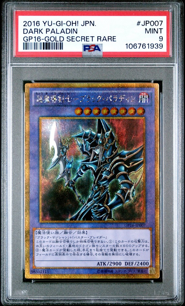 2016 YU-GI-OH! JAPANESE GOLD PACK GOLD SECRET RARE #JP007 DARK PALADIN PSA 9 2016 YU-GI-OH! JAPANESE GOLD PACK GOLD SECRET RARE #JP007 DARK PALADIN PSA 9 Purchase Info Thank you for your interest in this item consigned with PSA! By purchasing or making an offer on this item, you acknowledge and agree to the following terms: All sales are final. Returns not accepted. Payment must be made upon purchase of the item. All items are sold "as is" and without warranty of Collectors Universe, Inc. (d/b/a PSA), and ANY AND ALL IMPLIED WARRANTIES ARE DISCLAIMED AND EXCLUDED. Sales tax may apply depending on shipping address. PSA does not guarantee that another third-party grading company's authentication or certification of an item as genuine is correct or accurate. Neither a difference of opinion between third-party grading companies about authenticity, nor a company's subsequent reversal of its earlier authentication or certification of an item, will be a basis for rescinding a sale. Any dispute with another third-party grading company relating to the authenticity of an item must be resolved directly with that other company. Collectors' maximum liability in the event of loss or damage to an item during shipping will be the lesser of (a) the price paid for the item and (b) the change in fair market value of the item. You release Collectors from all other liability including for any claims of punitive damages, emotional distress, consequential damages, lost profits, or lost interest, except as prohibited by law. Shipping Purchased Items will be shipped directly from PSA Vault. You stay hands-free. PSA Vault When you purchase this item, you can save on sales tax and selling fees by keeping it in the PSA Vault, official Vault of eBay. Items already in PSA Vault and will be sent to PSA Vault will have no shipping charge Storage of any items with the PSA Vault will be subject to the PSA Vault Terms of Service. Consignment PSA has competitive rates on the world's largest collectibles marketplace with the option to list from the PSA Vault or immediately after PSA authentication and grading. Sale Price Under $100 $100 - $499 $500 - $999 $1,000 - $2,499 $2,500 - $4,999 $5,000+ Seller Fee 16% 14% 13% 10% 9% 7% Sellers pay a single fee as reflected above; no additional eBay fees are incurred. There is a $5 minimum fee on sold items.