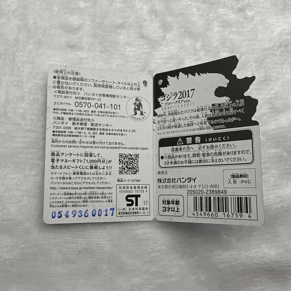 FIGURE TAG ONLY ...Bring home the ultimate Godzilla collectible with this Bandai 2017 Godzilla Earth Clear Blue Movie Exclusive figure. Standing at 6.7 inches tall and measuring 12.6 inches in length and 3.6 inches in width, this intricately detailed figure is a must-have for any fan of the iconic monster franchise. Made in Japan with high-quality materials, this figure is built to last and withstand the test of time. Featuring a stunning clear blue design and accompanied by its original tag card, this figure is the perfect addition to any toy or monster collection. Suitable for ages 3 and up, this Godzilla figure is sure to bring joy and excitement to fans of all ages. Don't miss your chance to own this rare and collectible piece.