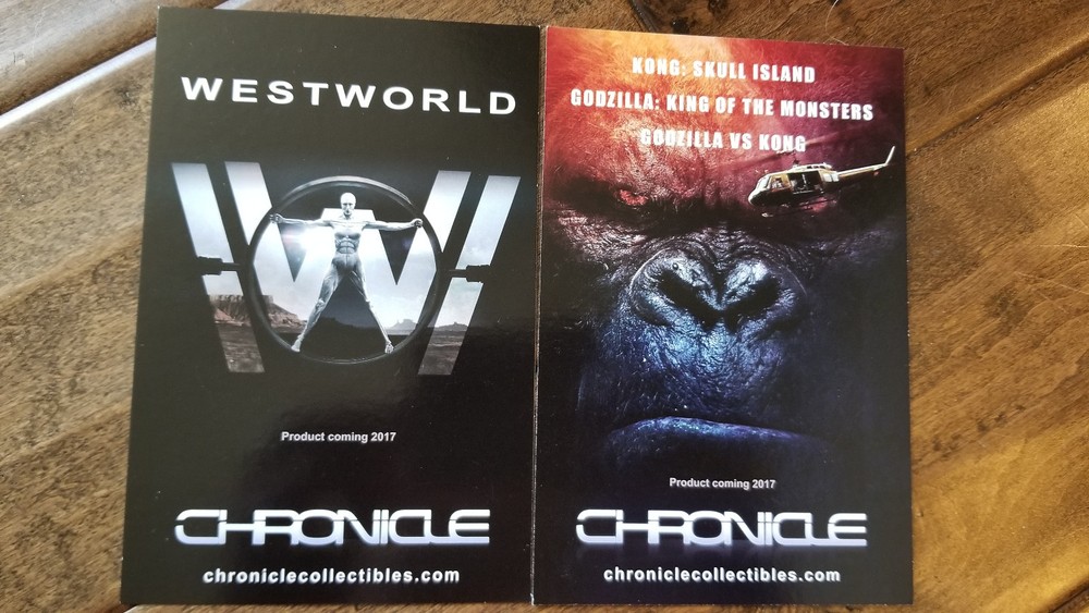 Its time again for our great offerings of hard to find items from 2016 SDCC Comic Con in San Diego. Promo Cards, Buttons, Posters, Postcards, Bags, Shirts, and so much more. Over 500 different items in stock. Check out all of our auctions. This SDCC Comic Con Promo Card was available at the show. Issued by Chronicle and the card is 4" x 6" , two sided and shows Westworld on one and King Kong Godzilla on the other. Winner pays $3.50 shipping and handling, we do combine shipping on multiple lots to save you money.