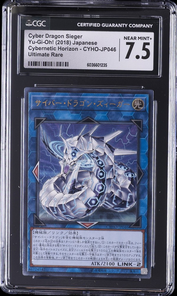 2018 YU-GI-OH! JAPANESE CYBERNETIC HORIZON - ULTIMATE RARE #CYHO-JP046 CYBER DRAGON SIEGER CGC 7.5 2018 YU-GI-OH! JAPANESE CYBERNETIC HORIZON - ULTIMATE RARE #CYHO-JP046 CYBER DRAGON SIEGER CGC 7.5 Purchase Info Thank you for your interest in bidding on this item consigned with PSA! By bidding on this item, you acknowledge and agree to the following terms: All sales are final. Returns not accepted. Payment must be made within 7 days of auction close. All items are sold "as is" and without warranty of Collectors Universe, Inc. (d/b/a PSA), and ANY AND ALL IMPLIED WARRANTIES ARE DISCLAIMED AND EXCLUDED. Sales tax may apply depending on shipping address. PSA does not guarantee that another third-party grading company's authentication or certification of an item as genuine is correct or accurate. Neither a difference of opinion between third-party grading companies about authenticity, nor a company's subsequent reversal of its earlier authentication or certification of an item, will be a basis for rescinding a sale. Any dispute with another third-party grading company relating to the authenticity of an item must be resolved directly with that other company. Collectors' maximum liability in the event of loss or damage to an item during shipping will be the lesser of (a) the price paid for the item and (b) the change in fair market value of the item. You release Collectors from all other liability including for any claims of punitive damages, emotional distress, consequential damages, lost profits, or lost interest, except as prohibited by law. Shipping Purchased Items will be shipped directly from PSA Vault. You stay hands-free. PSA Vault When you purchase this item, you can save on sales tax and selling fees by keeping it in the PSA Vault, official Vault of eBay. Items already in PSA Vault and will be sent to PSA Vault will have no shipping charge Storage of any items with the PSA Vault will be subject to the PSA Vault Terms of Service. Consignment PSA has competitive auction rates on the world's largest collectibles marketplace with the option to list from the PSA Vault or immediately after PSA authentication and grading. Sale Price Under $100 $100 - $499 $500 - $999 $1,000 - $2,499 $2,500 - $4,999 $5,000+ Seller Fee 13% + $3 flat 13% 12% 10% 9% 7% Sellers pay a single fee as reflected above; no additional eBay fees are incurred.