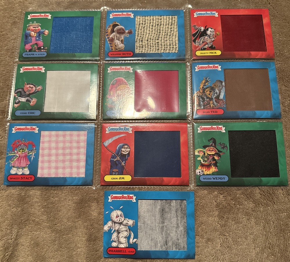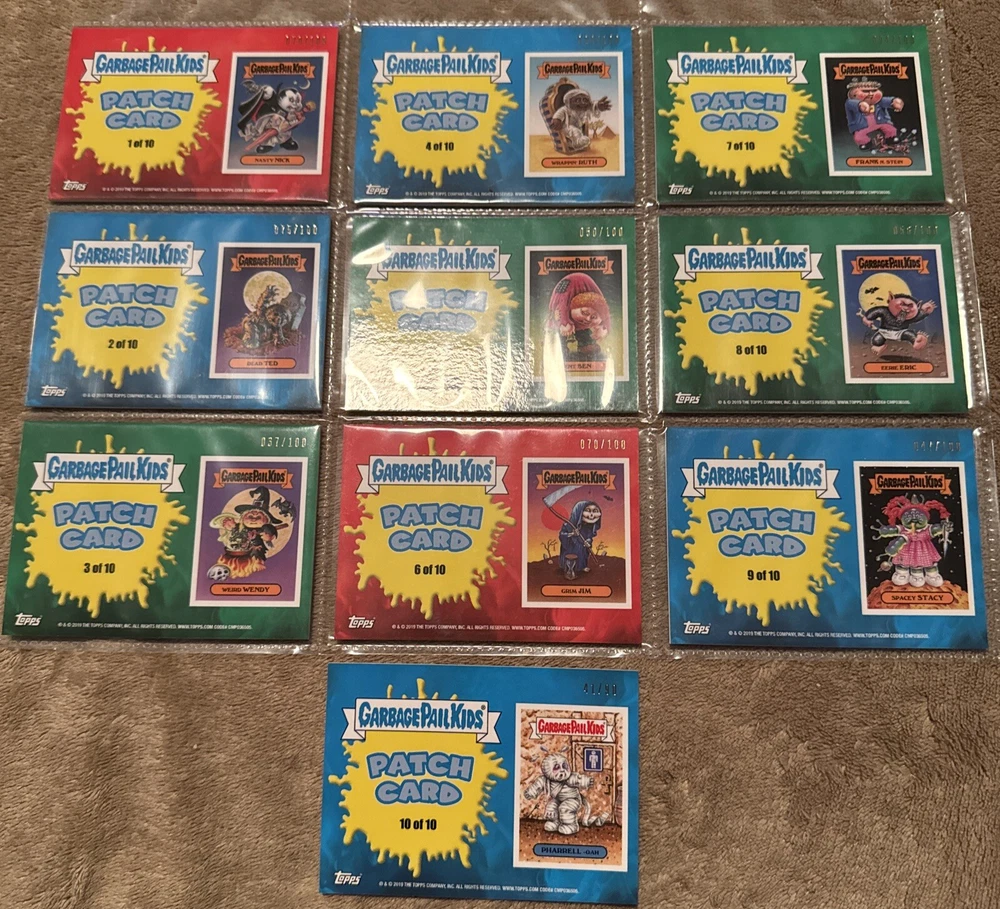 Garbage Pail Kids Horror-ible Patch set - all 10 cards These are pack fresh but do have the wear associated with this set - crimps in corner where fabric is placed, fabric thin at one side or a crease within, etc. Take a close look at pictures - there are pictures of each card individually. I tried to show what these areas look like. Very hard to find set. See pictures, ask any questions. No returns.
