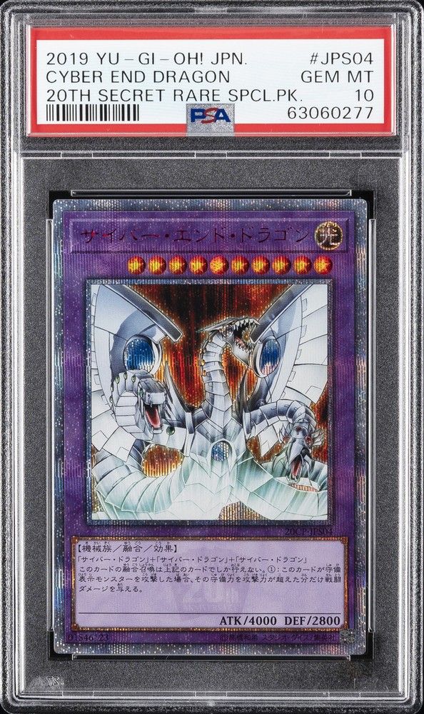 2019 YU-GI-OH! JAPANESE 20TH SECRET RARE SPECIAL PACK #JPS04 CYBER END DRAGON PSA 10 2019 YU-GI-OH! JAPANESE 20TH SECRET RARE SPECIAL PACK #JPS04 CYBER END DRAGON PSA 10 Purchase Info Thank you for your interest in this item consigned with PSA! By purchasing or making an offer on this item, you acknowledge and agree to the following terms: All sales are final. Returns not accepted. Payment must be made upon purchase of the item. All items are sold "as is" and without warranty of Collectors Universe, Inc. (d/b/a PSA), and ANY AND ALL IMPLIED WARRANTIES ARE DISCLAIMED AND EXCLUDED. Sales tax may apply depending on shipping address. PSA does not guarantee that another third-party grading company's authentication or certification of an item as genuine is correct or accurate. Neither a difference of opinion between third-party grading companies about authenticity, nor a company's subsequent reversal of its earlier authentication or certification of an item, will be a basis for rescinding a sale. Any dispute with another third-party grading company relating to the authenticity of an item must be resolved directly with that other company. Collectors' maximum liability in the event of loss or damage to an item during shipping will be the lesser of (a) the price paid for the item and (b) the change in fair market value of the item. You release Collectors from all other liability including for any claims of punitive damages, emotional distress, consequential damages, lost profits, or lost interest, except as prohibited by law. Shipping Purchased Items will be shipped directly from PSA Vault. You stay hands-free. PSA Vault When you purchase this item, you can save on sales tax and selling fees by keeping it in the PSA Vault, official Vault of eBay. Items already in PSA Vault and will be sent to PSA Vault will have no shipping charge Storage of any items with the PSA Vault will be subject to the PSA Vault Terms of Service. Consignment PSA has competitive rates on the world's largest collectibles marketplace with the option to list from the PSA Vault or immediately after PSA authentication and grading. Sale Price Under $100 $100 - $499 $500 - $999 $1,000 - $2,499 $2,500 - $4,999 $5,000+ Seller Fee 16% 14% 13% 10% 9% 7% Sellers pay a single fee as reflected above; no additional eBay fees are incurred. There is a $5 minimum fee on sold items.