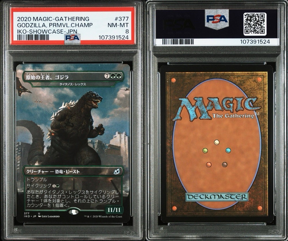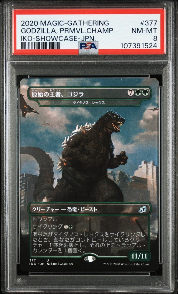 The product is a 2020 Magic: The Gathering card from the Ikoria: Lair of Behemoths set featuring the character Godzilla, Primeval Champion. This foil card with the number 377 is a collectible item for...