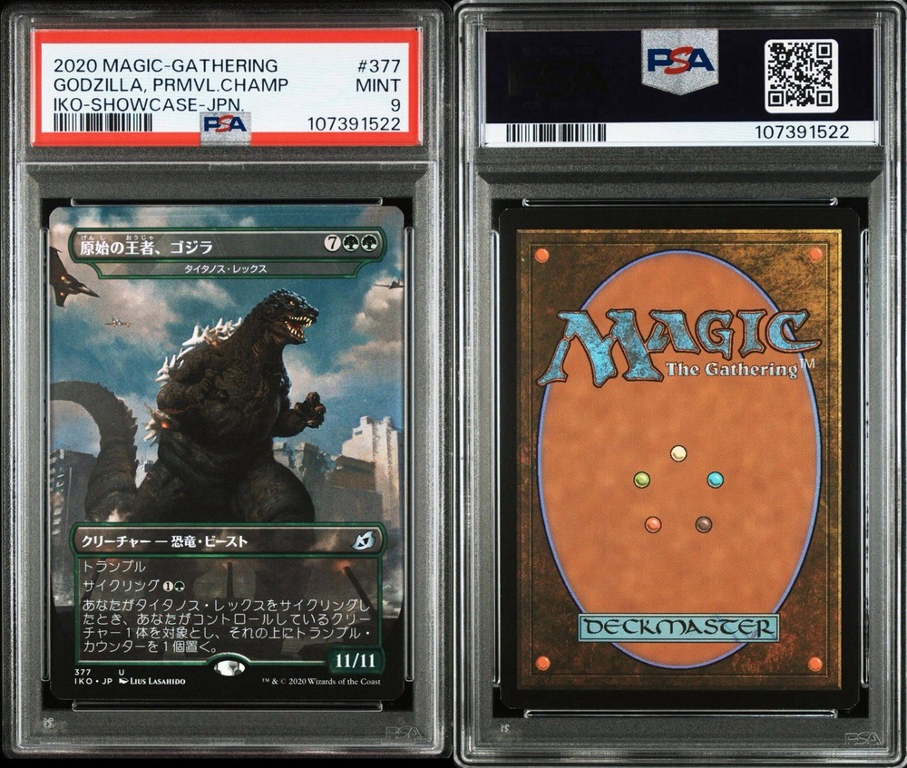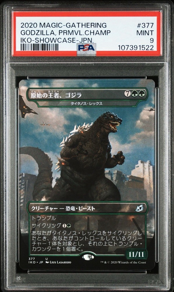 The product is a 2020 Magic: The Gathering card from the Ikoria: Lair of Behemoths set, featuring the character Godzilla, Primeval Champion. The card is a foil Japanese version, with the card number 377. This collectible card is a showcase-foil edition, making it a sought-after item for fans and collectors of Magic: The Gathering. With its unique design and limited availability, this card is sure to be a valuable addition to any card collection.