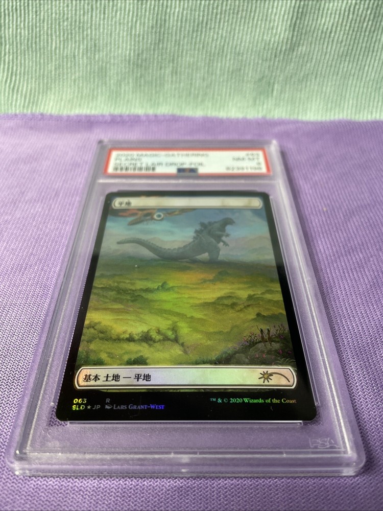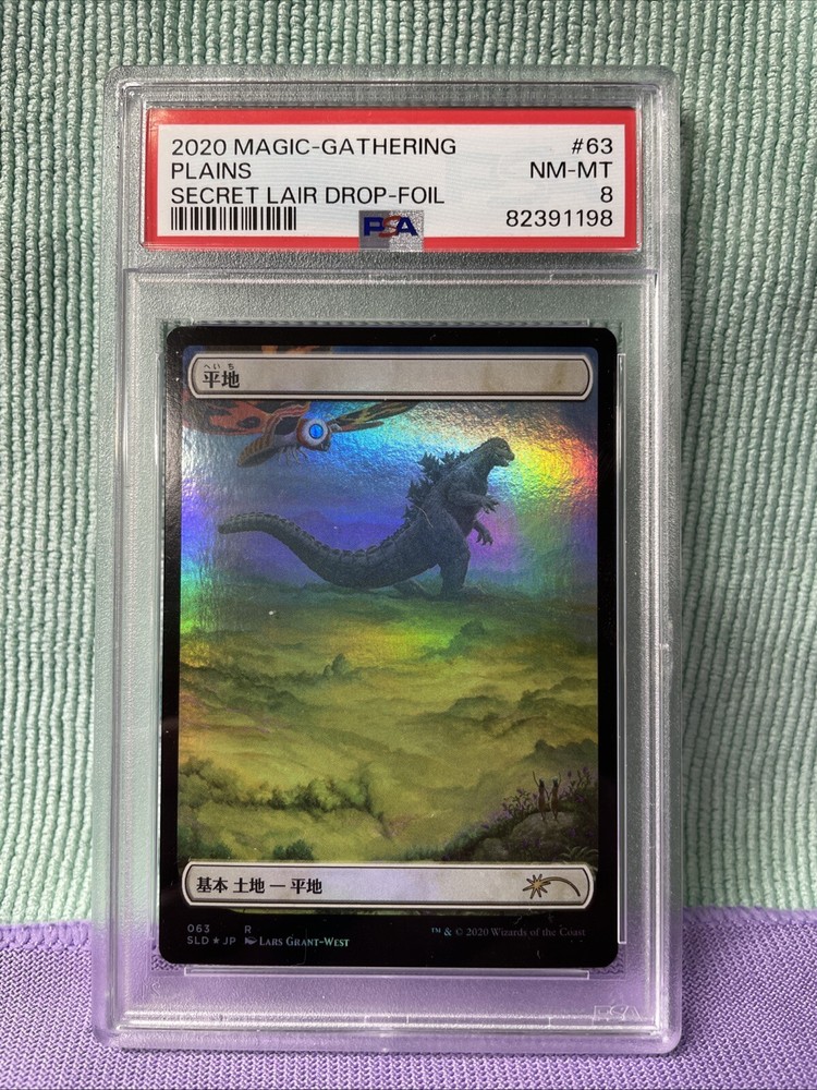 The product is a 2020 Magic: The Gathering Secret Lair Godzilla Plains card with card number 63, featuring a foil finish. This collectible card is graded as a PSA 8, which indicates its condition and authenticity. The card is part of the Toys & Hobbies category and specifically falls under Collectible Card Games for individuals seeking unique and limited edition Magic: The Gathering cards.