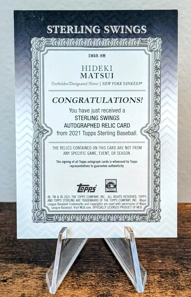 Step up to the plate with this 2021 Topps Sterling Swings Autograph Relics card featuring the dependable Hideki Matsui. With just 10 of these cards in existence, this rare piece of memorabilia is a must-have for any dedicated collector. The card, numbered SWAR-HM, showcases Matsui's autograph and a piece of his game-worn relic, adding a touch of authenticity and rarity to your collection.