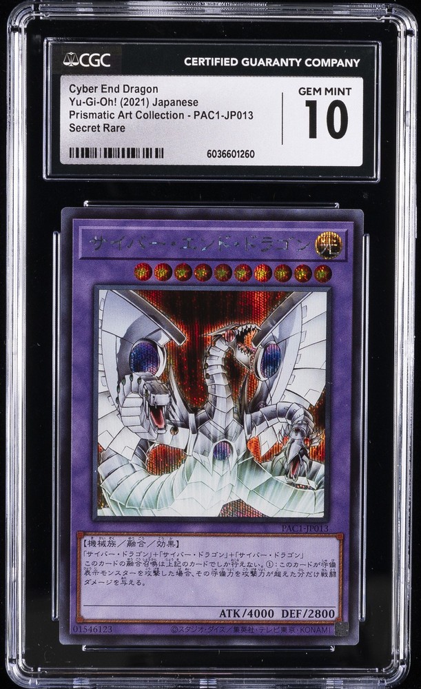 2021 YU-GI-OH! JAPANESE PRISMATIC ART COLL. - SECRET RARE #PAC1-JP013 CYBER END DRAGON CGC 10 GEM MINT 2021 YU-GI-OH! JAPANESE PRISMATIC ART COLL. - SECRET RARE #PAC1-JP013 CYBER END DRAGON CGC 10 GEM MINT Purchase Info Thank you for your interest in bidding on this item consigned with PSA! By bidding on this item, you acknowledge and agree to the following terms: All sales are final. Returns not accepted. Payment must be made within 7 days of auction close. All items are sold "as is" and without warranty of Collectors Universe, Inc. (d/b/a PSA), and ANY AND ALL IMPLIED WARRANTIES ARE DISCLAIMED AND EXCLUDED. Sales tax may apply depending on shipping address. PSA does not guarantee that another third-party grading company's authentication or certification of an item as genuine is correct or accurate. Neither a difference of opinion between third-party grading companies about authenticity, nor a company's subsequent reversal of its earlier authentication or certification of an item, will be a basis for rescinding a sale. Any dispute with another third-party grading company relating to the authenticity of an item must be resolved directly with that other company. Collectors' maximum liability in the event of loss or damage to an item during shipping will be the lesser of (a) the price paid for the item and (b) the change in fair market value of the item. You release Collectors from all other liability including for any claims of punitive damages, emotional distress, consequential damages, lost profits, or lost interest, except as prohibited by law. Shipping Purchased Items will be shipped directly from PSA Vault. You stay hands-free. PSA Vault When you purchase this item, you can save on sales tax and selling fees by keeping it in the PSA Vault, official Vault of eBay. Items already in PSA Vault and will be sent to PSA Vault will have no shipping charge Storage of any items with the PSA Vault will be subject to the PSA Vault Terms of Service. Consignment PSA has competitive auction rates on the world's largest collectibles marketplace with the option to list from the PSA Vault or immediately after PSA authentication and grading. Sale Price Under $100 $100 - $499 $500 - $999 $1,000 - $2,499 $2,500 - $4,999 $5,000+ Seller Fee 13% + $3 flat 13% 12% 10% 9% 7% Sellers pay a single fee as reflected above; no additional eBay fees are incurred.