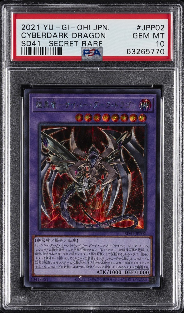 2021 YU-GI-OH! JAPANESE STRUCTURE DECK: CYBER STYLE'S SUCCESSOR SECRET RARE #JPP02 CYBERDARK DRAGON PSA 10 2021 YU-GI-OH! JAPANESE STRUCTURE DECK: CYBER STYLE'S SUCCESSOR SECRET RARE #JPP02 CYBERDARK DRAGON PSA 10 Purchase Info Thank you for your interest in this item consigned with PSA! By purchasing or making an offer on this item, you acknowledge and agree to the following terms: All sales are final. Returns not accepted. Payment must be made upon purchase of the item. All items are sold "as is" and without warranty of Collectors Universe, Inc. (d/b/a PSA), and ANY AND ALL IMPLIED WARRANTIES ARE DISCLAIMED AND EXCLUDED. Sales tax may apply depending on shipping address. PSA does not guarantee that another third-party grading company's authentication or certification of an item as genuine is correct or accurate. Neither a difference of opinion between third-party grading companies about authenticity, nor a company's subsequent reversal of its earlier authentication or certification of an item, will be a basis for rescinding a sale. Any dispute with another third-party grading company relating to the authenticity of an item must be resolved directly with that other company. Collectors' maximum liability in the event of loss or damage to an item during shipping will be the lesser of (a) the price paid for the item and (b) the change in fair market value of the item. You release Collectors from all other liability including for any claims of punitive damages, emotional distress, consequential damages, lost profits, or lost interest, except as prohibited by law. Shipping Purchased Items will be shipped directly from PSA Vault. You stay hands-free. PSA Vault When you purchase this item, you can save on sales tax and selling fees by keeping it in the PSA Vault, official Vault of eBay. Items already in PSA Vault and will be sent to PSA Vault will have no shipping charge Storage of any items with the PSA Vault will be subject to the PSA Vault Terms of Service. Consignment PSA has competitive rates on the world's largest collectibles marketplace with the option to list from the PSA Vault or immediately after PSA authentication and grading. Sale Price Under $100 $100 - $499 $500 - $999 $1,000 - $2,499 $2,500 - $4,999 $5,000+ Seller Fee 13% + $3 flat 13% 12% 10% 9% 7% Sellers pay a single fee as reflected above; no additional eBay fees are incurred.