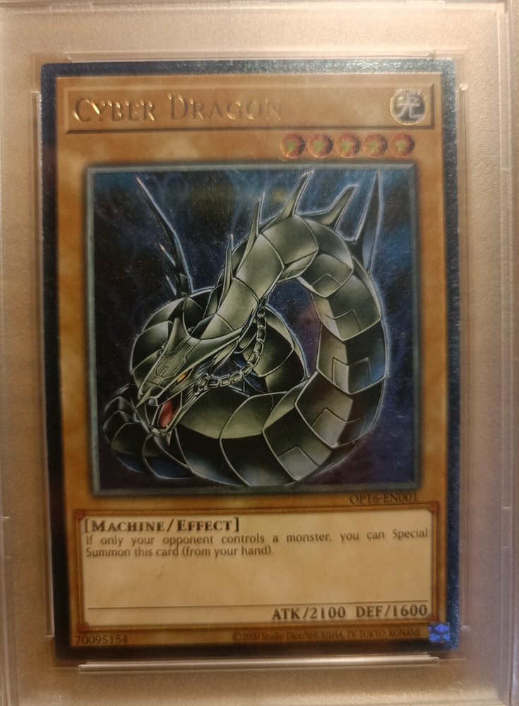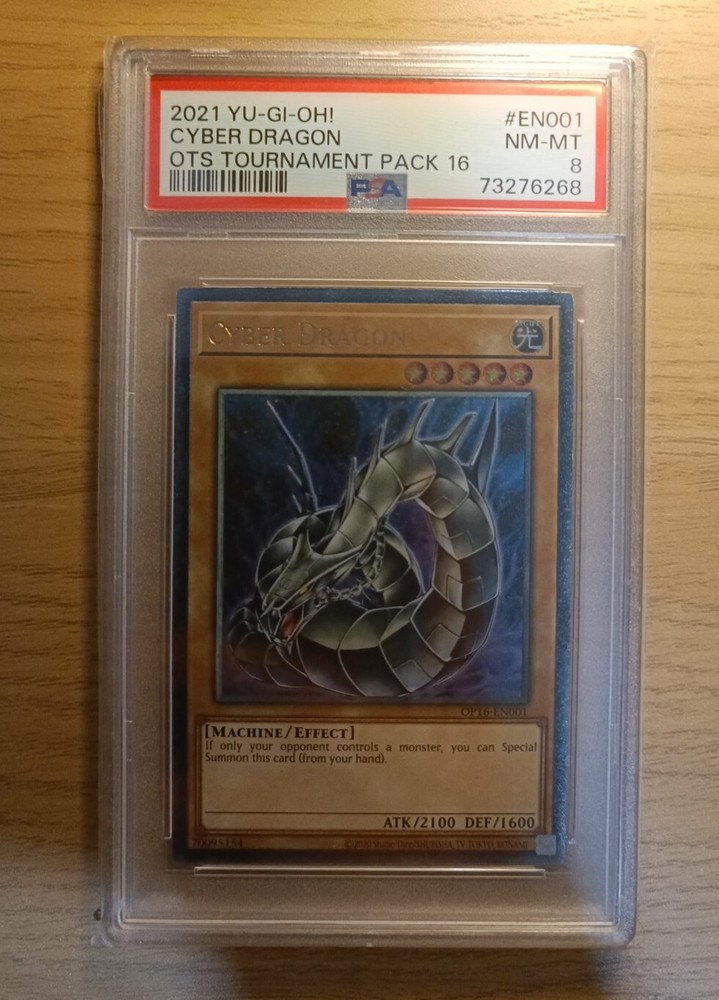 This 2021 Yu-Gi-Oh! card features the powerful Cyber Dragon in Ultimate Rare holographic finish. It has been professionally graded by PSA with a score of 8, ensuring its near mint to mint condition. The card is from the OTS Tournament Pack 16 set and features the English language. At 6+ years old, this card is perfect for collectors of all ages who appreciate the Machine creature type and the Attribute/MTG: Colour of Light. The Japanese card size and the rarity of this Ultimate Rare card make it a valuable addition to any Yu-Gi-Oh! TCG collection. Purchase this highly sought-after Cyber Dragon card from manufacturer Konami and enjoy its effect in your next duel.