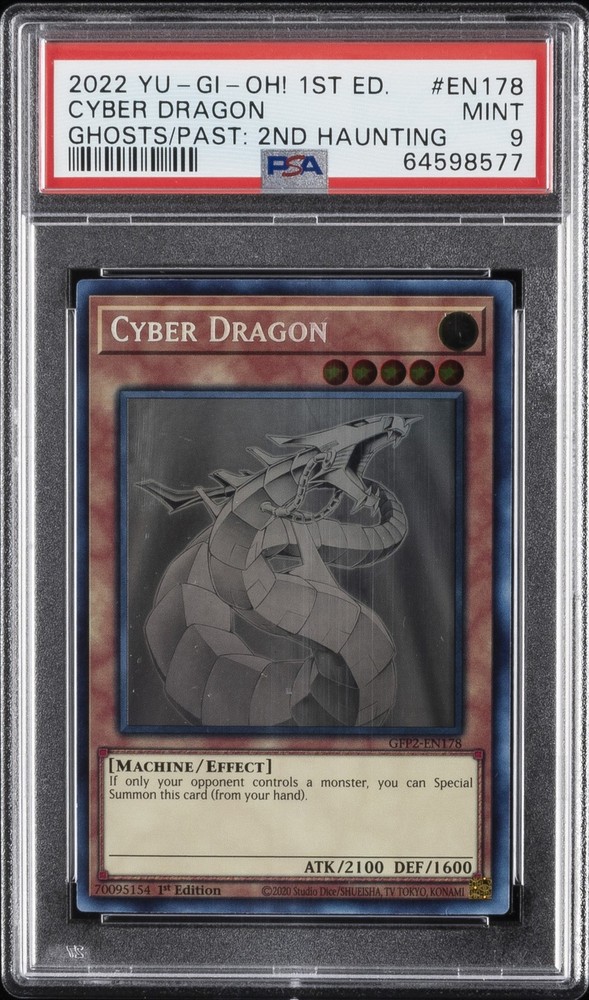 2022 YU-GI-OH! GFP2-GHOSTS FROM THE PAST: THE 2ND HAUNTING 1ST EDITION #EN178 CYBER DRAGON PSA 9 2022 YU-GI-OH! GFP2-GHOSTS FROM THE PAST: THE 2ND HAUNTING 1ST EDITION #EN178 CYBER DRAGON PSA 9 Purchase Info Thank you for your interest in bidding on this item consigned with PSA! By bidding on this item, you acknowledge and agree to the following terms: All sales are final. Returns not accepted. Payment must be made within 7 days of auction close. All items are sold "as is" and without warranty of Collectors Universe, Inc. (d/b/a PSA), and ANY AND ALL IMPLIED WARRANTIES ARE DISCLAIMED AND EXCLUDED. Sales tax may apply depending on shipping address. PSA does not guarantee that another third-party grading company's authentication or certification of an item as genuine is correct or accurate. Neither a difference of opinion between third-party grading companies about authenticity, nor a company's subsequent reversal of its earlier authentication or certification of an item, will be a basis for rescinding a sale. Any dispute with another third-party grading company relating to the authenticity of an item must be resolved directly with that other company. Collectors' maximum liability in the event of loss or damage to an item during shipping will be the lesser of (a) the price paid for the item and (b) the change in fair market value of the item. You release Collectors from all other liability including for any claims of punitive damages, emotional distress, consequential damages, lost profits, or lost interest, except as prohibited by law. Shipping Purchased Items will be shipped directly from PSA Vault. You stay hands-free. PSA Vault When you purchase this item, you can save on sales tax and selling fees by keeping it in the PSA Vault, official Vault of eBay. Items already in PSA Vault and will be sent to PSA Vault will have no shipping charge Storage of any items with the PSA Vault will be subject to the PSA Vault Terms of Service. Consignment PSA has competitive auction rates on the world's largest collectibles marketplace with the option to list from the PSA Vault or immediately after PSA authentication and grading. Sale Price Under $100 $100 - $499 $500 - $999 $1,000 - $2,499 $2,500 - $4,999 $5,000+ Seller Fee 13% + $3 flat 13% 12% 10% 9% 7% Sellers pay a single fee as reflected above; no additional eBay fees are incurred.