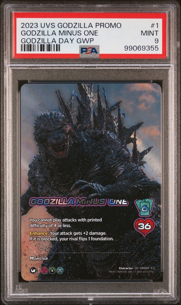 2023 UNIVERSUS GODZILLA PROMOS TCGPLAYER GODZILLA DAY GIFT WITH PURCHASE #1 GODZILLA MINUS ONE PSA 9 2023 UNIVERSUS GODZILLA PROMOS TCGPLAYER GODZILLA DAY GIFT WITH PURCHASE #1 GODZILLA MINUS ONE PSA 9 Purchase Info Thank you for your interest in this item consigned with PSA! By purchasing or making an offer on this item, you acknowledge and agree to the following terms: All sales are final. Returns not accepted. Payment must be made upon purchase of the item. All items are sold "as is" and without warranty of Collectors Universe, Inc. (d/b/a PSA), and ANY AND ALL IMPLIED WARRANTIES ARE DISCLAIMED AND EXCLUDED. Sales tax may apply depending on shipping address. PSA does not guarantee that another third-party grading company's authentication or certification of an item as genuine is correct or accurate. Neither a difference of opinion between third-party grading companies about authenticity, nor a company's subsequent reversal of its earlier authentication or certification of an item, will be a basis for rescinding a sale. Any dispute with another third-party grading company relating to the authenticity of an item must be resolved directly with that other company. Collectors' maximum liability in the event of loss or damage to an item during shipping will be the lesser of (a) the price paid for the item and (b) the change in fair market value of the item. You release Collectors from all other liability including for any claims of punitive damages, emotional distress, consequential damages, lost profits, or lost interest, except as prohibited by law. Shipping Purchased Items will be shipped directly from PSA Vault. You stay hands-free. PSA Vault When you purchase this item, you can save on sales tax and selling fees by keeping it in the PSA Vault, official Vault of eBay. Items already in PSA Vault and will be sent to PSA Vault will have no shipping charge Storage of any items with the PSA Vault will be subject to the PSA Vault Terms of Service. Consignment PSA has competitive rates on the world's largest collectibles marketplace with the option to list from the PSA Vault or immediately after PSA authentication and grading. Sale Price Under $100 $100 - $499 $500 - $999 $1,000 - $2,499 $2,500 - $4,999 $5,000+ Seller Fee 16% 14% 13% 10% 9% 7% Sellers pay a single fee as reflected above; no additional eBay fees are incurred. There is a $5 minimum fee on sold items.