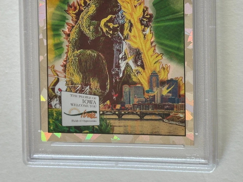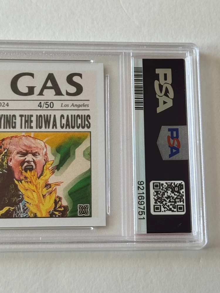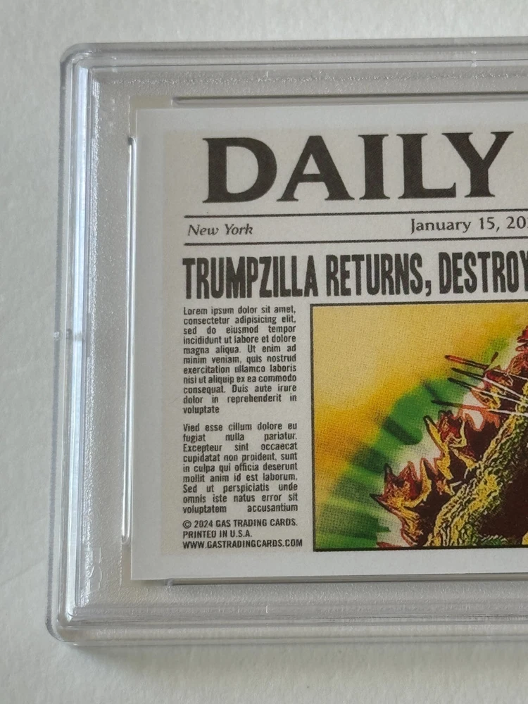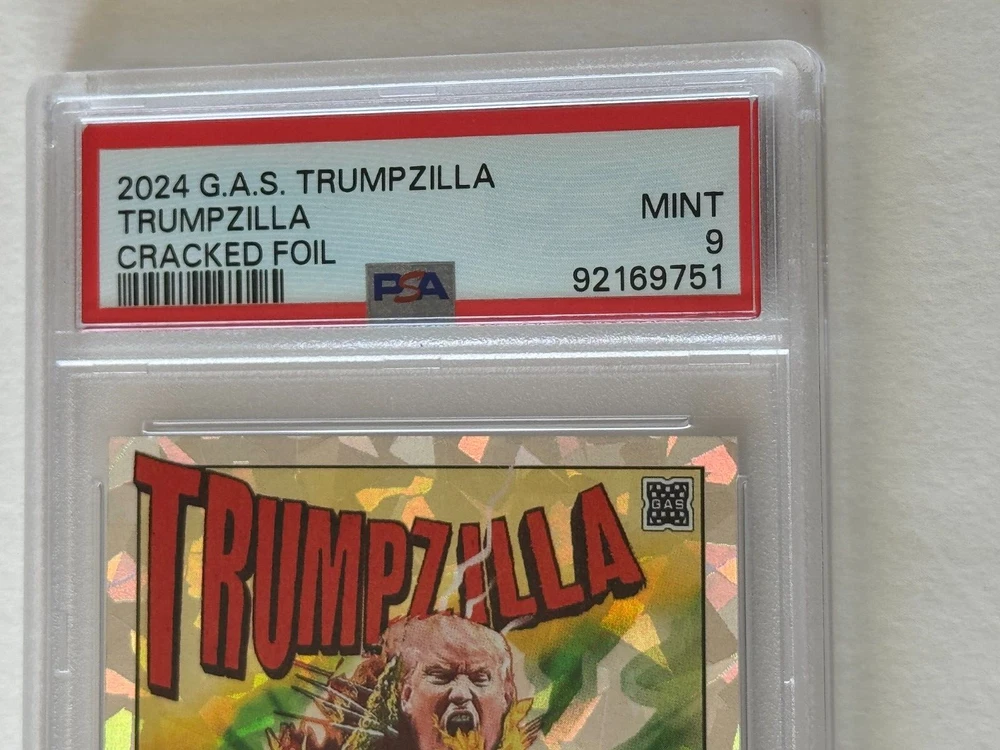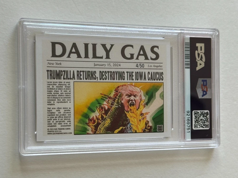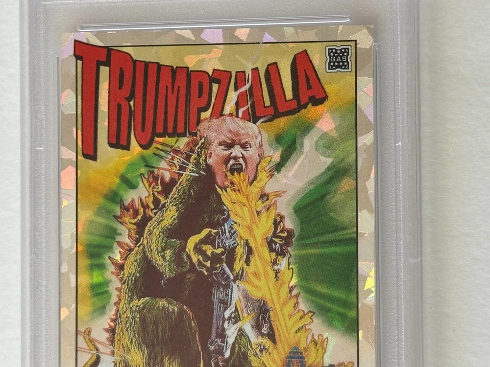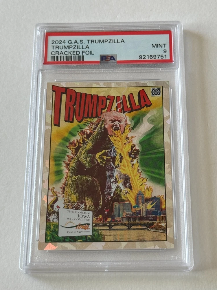 THANK YOU for taking the time to view my eBay auction . To follow is a written description of this item that's detailed & accurate and including the items features & benefits, contents, condition as well as Shipping Fees and Payment Options. 2024 GAS Trading Cards DONALD JOHN TRUMP "TRUMPZILLA" TRADING CARD GODZILLA MASH-UP IOWA CAUCUS January 15, 2024 LIMITED EDITION Cracked Ice Prism Variant ONLINE EXCLUSIVE Crash Numbered Individual Serial Numbering # 4 / 50 Only 50 Printed and Exists Professionally Graded & Authenticated PSA 9 Mint OUT OF PRINT DESCRIPTION This trading card was offered by GAS Trading Cards and was a timed release that elapsed and is now out of print and sold out. THANK YOU FOR VISITING THIS AUCTION SHIPPING AND HANDLING: Our non-collectibles ship in very secure packaging to ensure your collectible is delivered to you in the best possible condition . Please review our stellar feedback regarding our customers comments on the QUALITY of our items and the QUALITY of our SHIPPING (Fast Delivery and Iron Clad Protective Packaging!). Please inquire regarding any S&H discounts for multiple items to be purchased, which is based on weight and dimensions. DOMESTIC (Anywhere in the USA) BIDDERS U.S.A. Optional U.S. Postal Insurance (for USA Destinations ONLY) Please ADD $2.00 for coverage of values up to $50 Insurance fee for values of $50.01 - $100 add $3.00 Insurance fee for values of $100.01 - $200 add $4.00 Insurance fee for values $200.01+ is an additional $4.00 plus $1.00 per $100 increment or fraction thereof. Sorry, I'm not responsible for Uninsured Deliveries (but you can check out my Feedback for comments on my reliable delivery & sturdy packaging. I've never encountered a problem with postal damage or non-delivery (lost mail). INTERNATIONAL BIDDERS: PLEASE INQUIRE FIRST BEFORE BIDDING IF YOU HAVE ANY QUESTIONS. International (NON-USA = Canada, Mexico, U.K., Asia, etc.) Buyers Bids (U.S. Funds Only) are Welcomed and Accepted & All Items Can Be Shipped Worldwide via AIRMAIL (Surface Mail is no longer available), but you must have adequate feedback otherwise I reserve the right to cancel your bid before the auction closes. Due to size dimensions and weight of the product and packaging, although I do offer international shipping and appreciate, respect and honor international bidders and customers, sometimes it is cost prohibitive on the shipping side for purchases, which I understand, and for that, if you are international and have a domestic (USA) delivery address through a friend or relative, I can ship to US addresses which I recommend if that is an option, but that address MUST BE registed to your account on Pay Pal, otherwise if you have a domestic (USA) friend or relative who has an eBay account, they could bid on this on your behalf to ship to the US. International CANADA International S&H Other Non-North America International (UK, Germany, France, Switzerland, Europe, Spain, South America, Australia, Japan, Asia, Etc.) NOTE TO INTERNATIONAL BIDDERS - Please know that the declared value of the sale price is the declared value which will be used when shipping the item. Unfortunately, it's against policy to circumvent any duties, taxes or fees related to the value by altering the value or status (i.e. this is not a gift, this is a sales transaction and is merchandise). I appologize that those facts are out of my control and it is your country, and not me who may charge whatever fees they deem necessary related to international sales transactions. OTHER IMPORTANT S&H DETAILS: All Items Protectively Packaged Sturdy and Secure, often times resulting in oversized and heavier parcels. Check out my feedback for testimonials on the quality of my packaging, quality of merchandise and speed of delivery. Sorry, S&H fees are not negotiable and are clearly described and listed above. Multiple Auction winners may (or may not) benefit a S&H discount (Depending on Weight, Size and Quantity), please inquire for details prior to bidding on multiple items. PLEASE INQUIRE BEFORE BIDDING FOR DETAILS. Odd shaped items may not be shipped together due to possible postal damages (i.e. a CD and an LP or a Poster can not or should not ship together with a Magazine, Comic or Sketchbook). With original comic art, being FLAT, only similar sized items should ship with them. METHODS OF PAYMENT: YES! You can make payment online through PAY PAL SHIPPING & DELIVERY DETAILS : All Items are Sent via U.S. Postal Service unless otherwise described. As many know, postal rates have increased and now factored into pricing is both weight and size dimensions, so oversized items are now more expensive to ship. I do prepare and handle my packages, using very sturdy oversized packaging materials to protect your item during transit so it is delivered sturdy and secure for you to enjoy quickly in collector’s investment quality condition. Expect Delivery of the Item in approx. 2-10 days (depending upon your location & method shipped) upon receipt of payment and clearance of funds. Airmail for International Bidders takes anywhere from 1-2 weeks. AGAIN, Please review my over 8,400 Positive “Green Star” eBay Feedback comments received regarding the quality merchandise, secure packaging, customer satisfaction and quick communication & speedy delivery. I never ever ask for or solicit customers for any eBay feedback, these are all comments that customers initiated and went out of their way and took the initiative to express their complete satisfaction and appreciation! In turn, I leave glowingly POSITIVE high praise feedback to buyers as well of course! FINAL DETAILS: PLEASE Include the mailing address (please PRINT clearly, because no matter how clear you think your penmanship is, it is in your best interest for accurate delivery to TYPE (respond via e'mail) your information) where you want your item sent along with this item number and/or name/title of the item (to expedite the process) along with payment to ens