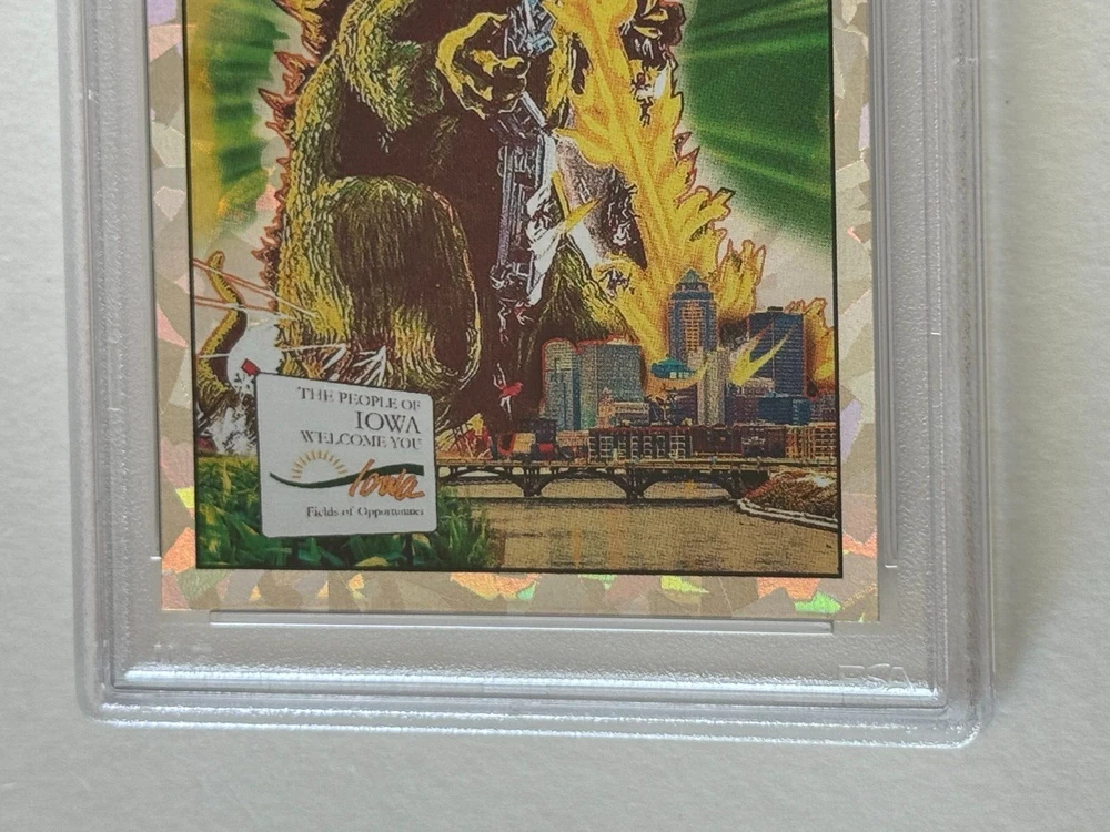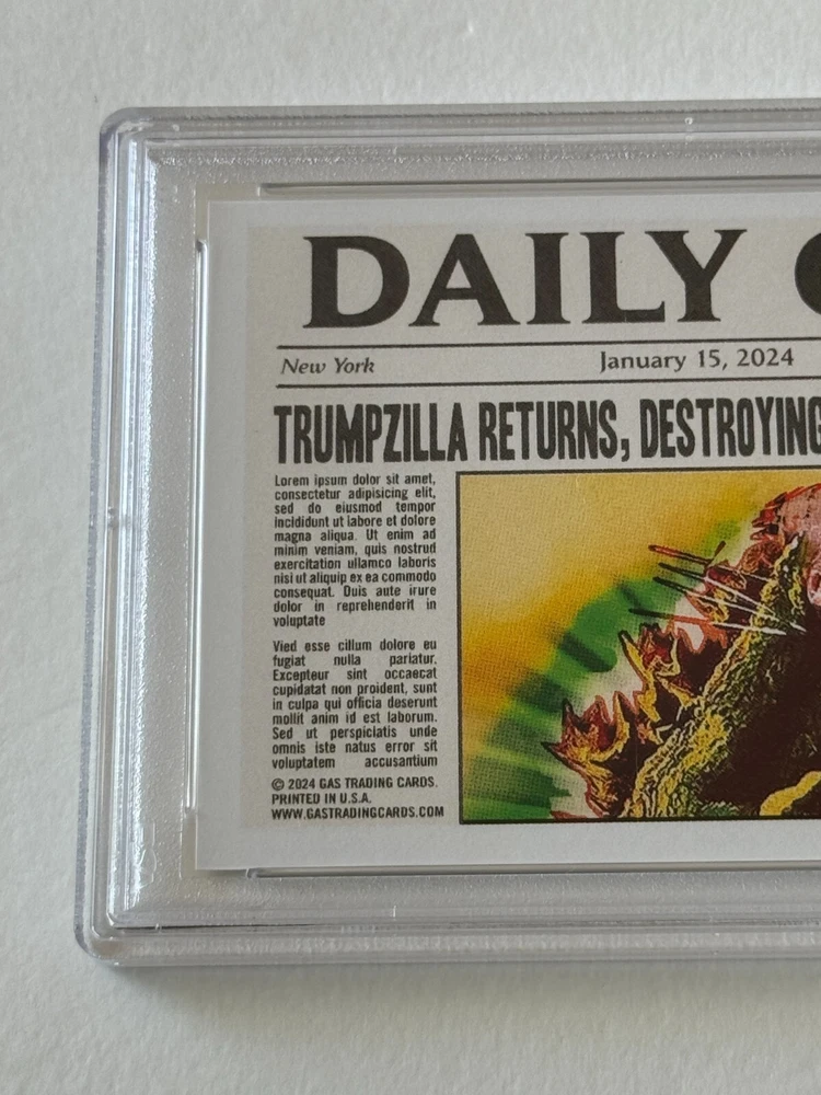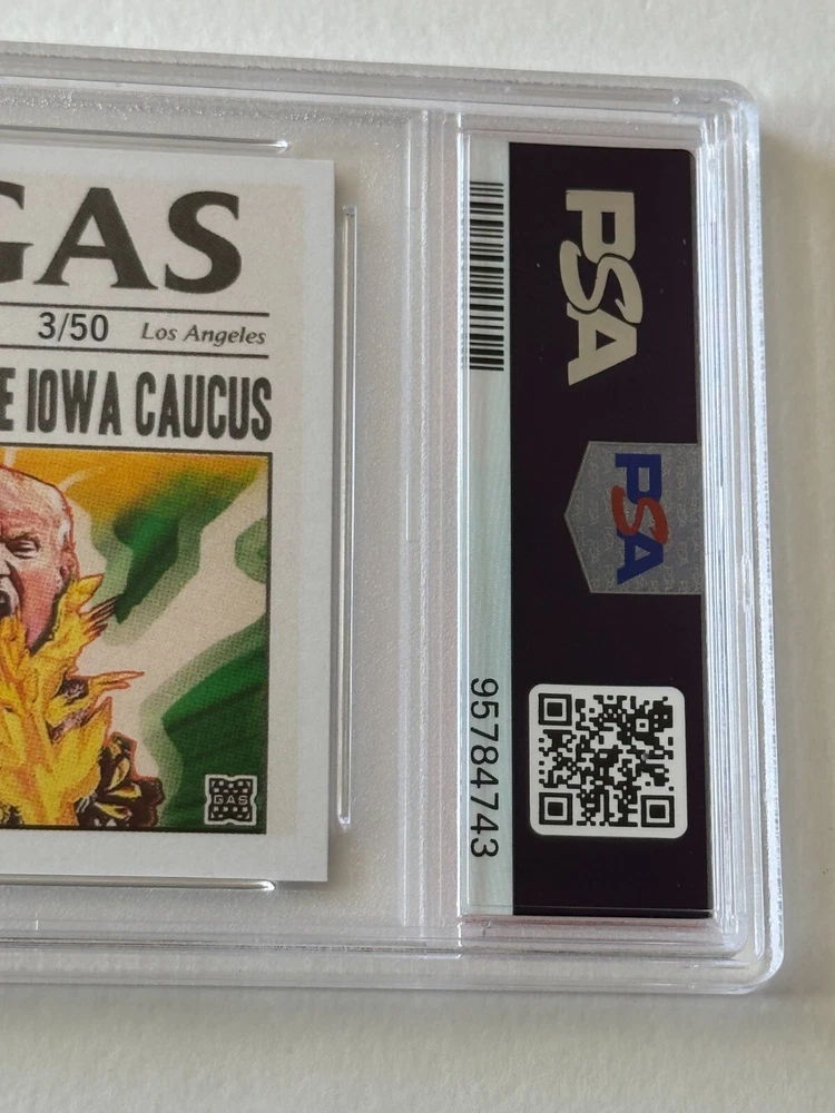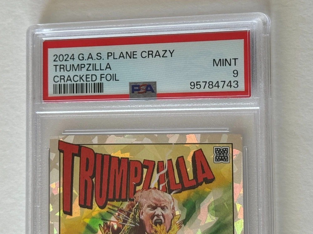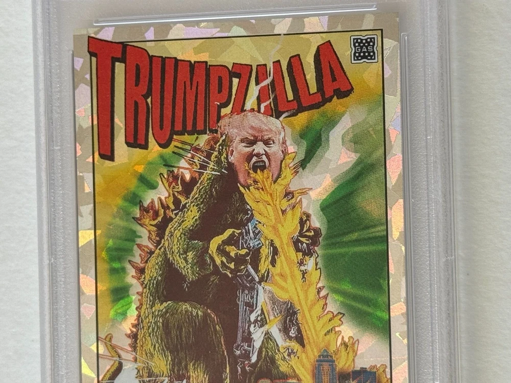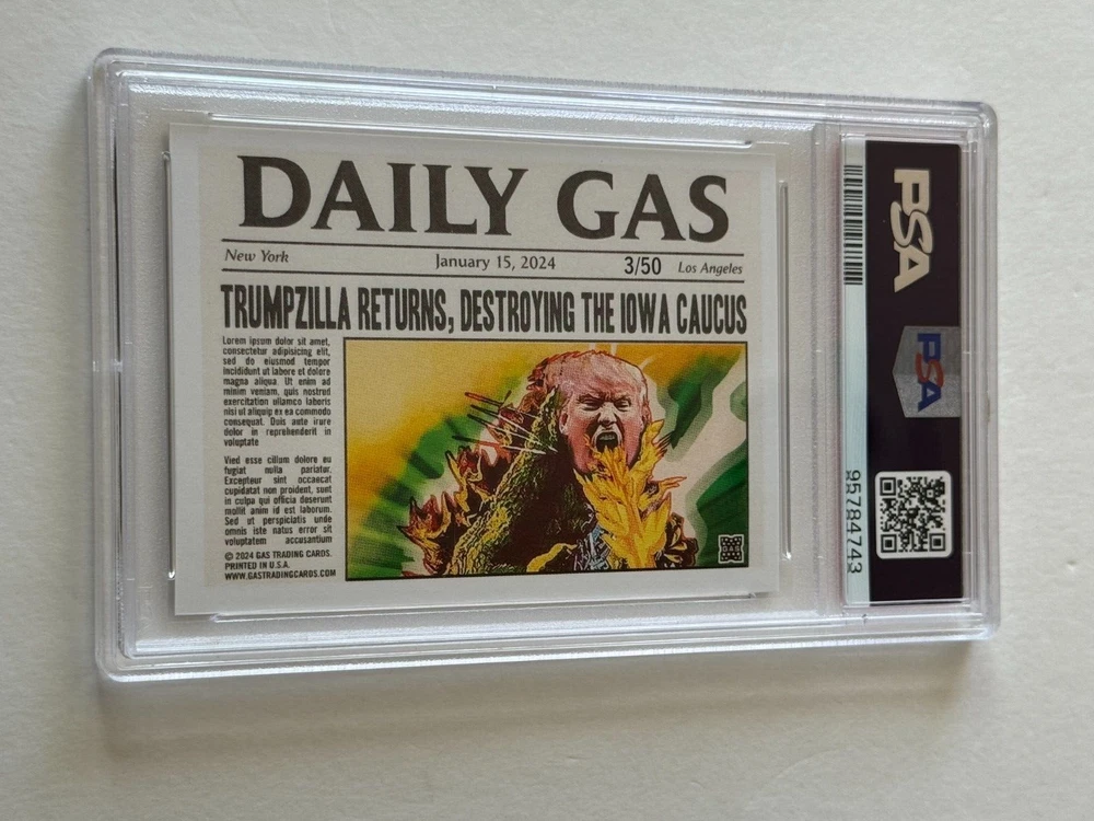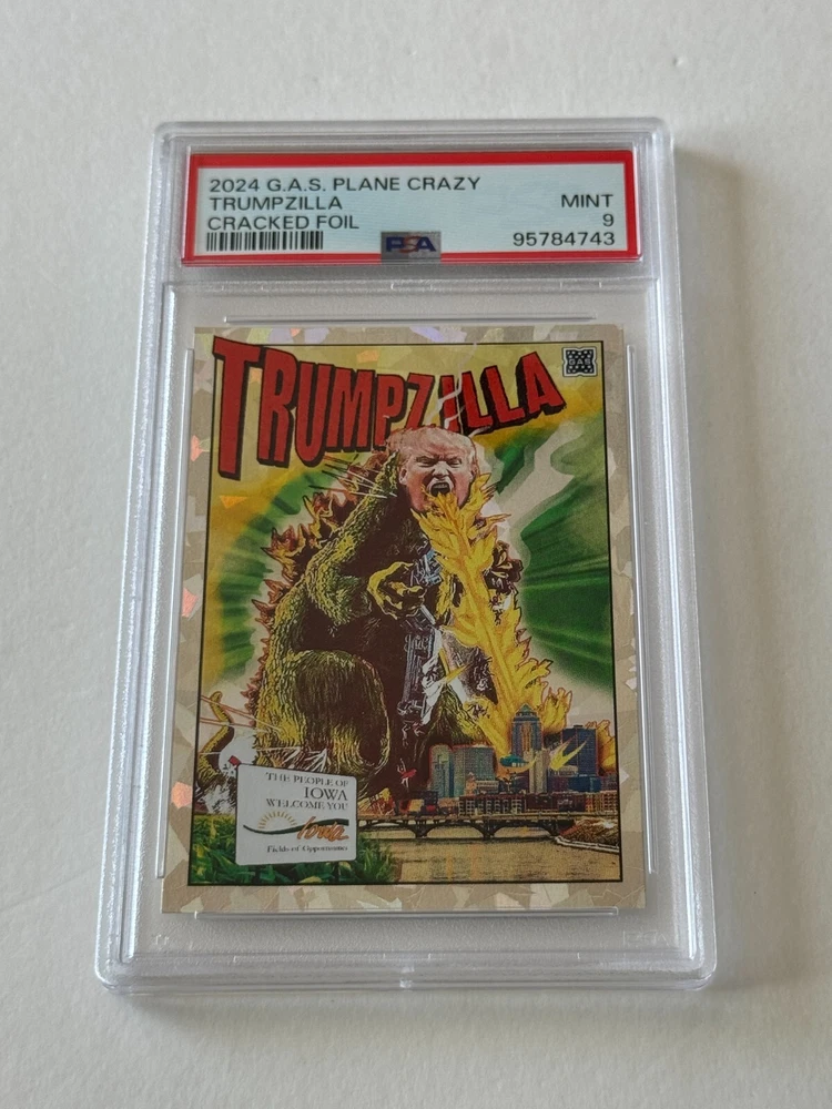 THANK YOU for taking the time to view my eBay auction . To follow is a written description of this item that's detailed & accurate and including the items features & benefits, contents, condition as well as Shipping Fees and Payment Options. 2024 GAS Trading Cards DONALD JOHN TRUMP "TRUMPZILLA" TRADING CARD GODZILLA MASH-UP IOWA CAUCUS January 15, 2024 LIMITED EDITION Cracked Ice Prism Variant ONLINE EXCLUSIVE Crash Numbered Individual Serial Numbering # 3 / 50 Only 50 Printed and Exists Professionally Graded & Authenticated PSA 9 Mint OUT OF PRINT DESCRIPTION This trading card was offered by GAS Trading Cards and was a timed release that elapsed and is now out of print and sold out. THANK YOU FOR VISITING THIS AUCTION SHIPPING AND HANDLING: Our non-collectibles ship in very secure packaging to ensure your collectible is delivered to you in the best possible condition . Please review our stellar feedback regarding our customers comments on the QUALITY of our items and the QUALITY of our SHIPPING (Fast Delivery and Iron Clad Protective Packaging!). Please inquire regarding any S&H discounts for multiple items to be purchased, which is based on weight and dimensions. DOMESTIC (Anywhere in the USA) BIDDERS U.S.A. Optional U.S. Postal Insurance (for USA Destinations ONLY) Please ADD $2.00 for coverage of values up to $50 Insurance fee for values of $50.01 - $100 add $3.00 Insurance fee for values of $100.01 - $200 add $4.00 Insurance fee for values $200.01+ is an additional $4.00 plus $1.00 per $100 increment or fraction thereof. Sorry, I'm not responsible for Uninsured Deliveries (but you can check out my Feedback for comments on my reliable delivery & sturdy packaging. I've never encountered a problem with postal damage or non-delivery (lost mail). INTERNATIONAL BIDDERS: PLEASE INQUIRE FIRST BEFORE BIDDING IF YOU HAVE ANY QUESTIONS. International (NON-USA = Canada, Mexico, U.K., Asia, etc.) Buyers Bids (U.S. Funds Only) are Welcomed and Accepted & All Items Can Be Shipped Worldwide via AIRMAIL (Surface Mail is no longer available), but you must have adequate feedback otherwise I reserve the right to cancel your bid before the auction closes. Due to size dimensions and weight of the product and packaging, although I do offer international shipping and appreciate, respect and honor international bidders and customers, sometimes it is cost prohibitive on the shipping side for purchases, which I understand, and for that, if you are international and have a domestic (USA) delivery address through a friend or relative, I can ship to US addresses which I recommend if that is an option, but that address MUST BE registed to your account on Pay Pal, otherwise if you have a domestic (USA) friend or relative who has an eBay account, they could bid on this on your behalf to ship to the US. International CANADA International S&H Other Non-North America International (UK, Germany, France, Switzerland, Europe, Spain, South America, Australia, Japan, Asia, Etc.) NOTE TO INTERNATIONAL BIDDERS - Please know that the declared value of the sale price is the declared value which will be used when shipping the item. Unfortunately, it's against policy to circumvent any duties, taxes or fees related to the value by altering the value or status (i.e. this is not a gift, this is a sales transaction and is merchandise). I appologize that those facts are out of my control and it is your country, and not me who may charge whatever fees they deem necessary related to international sales transactions. OTHER IMPORTANT S&H DETAILS: All Items Protectively Packaged Sturdy and Secure, often times resulting in oversized and heavier parcels. Check out my feedback for testimonials on the quality of my packaging, quality of merchandise and speed of delivery. Sorry, S&H fees are not negotiable and are clearly described and listed above. Multiple Auction winners may (or may not) benefit a S&H discount (Depending on Weight, Size and Quantity), please inquire for details prior to bidding on multiple items. PLEASE INQUIRE BEFORE BIDDING FOR DETAILS. Odd shaped items may not be shipped together due to possible postal damages (i.e. a CD and an LP or a Poster can not or should not ship together with a Magazine, Comic or Sketchbook). With original comic art, being FLAT, only similar sized items should ship with them. METHODS OF PAYMENT: YES! You can make payment online through PAY PAL SHIPPING & DELIVERY DETAILS : All Items are Sent via U.S. Postal Service unless otherwise described. As many know, postal rates have increased and now factored into pricing is both weight and size dimensions, so oversized items are now more expensive to ship. I do prepare and handle my packages, using very sturdy oversized packaging materials to protect your item during transit so it is delivered sturdy and secure for you to enjoy quickly in collector’s investment quality condition. Expect Delivery of the Item in approx. 2-10 days (depending upon your location & method shipped) upon receipt of payment and clearance of funds. Airmail for International Bidders takes anywhere from 1-2 weeks. AGAIN, Please review my over 8,400 Positive “Green Star” eBay Feedback comments received regarding the quality merchandise, secure packaging, customer satisfaction and quick communication & speedy delivery. I never ever ask for or solicit customers for any eBay feedback, these are all comments that customers initiated and went out of their way and took the initiative to express their complete satisfaction and appreciation! In turn, I leave glowingly POSITIVE high praise feedback to buyers as well of course! FINAL DETAILS: PLEASE Include the mailing address (please PRINT clearly, because no matter how clear you think your penmanship is, it is in your best interest for accurate delivery to TYPE (respond via e'mail) your information) where you want your item sent along with this item number and/or name/title of the item (to expedite the process) along with payment to ens