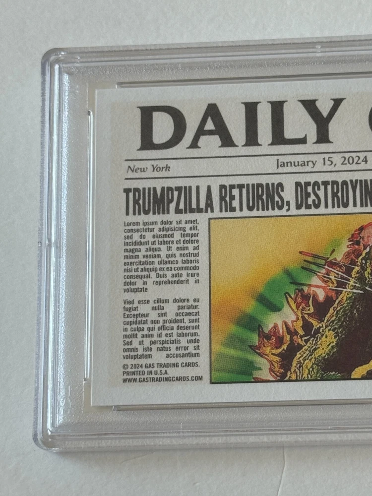 THANK YOU for taking the time to view my eBay auction . To follow is a written description of this item that's detailed & accurate and including the items features & benefits, contents, condition as well as Shipping Fees and Payment Options. 2024 GAS Trading Cards DONALD JOHN TRUMP "TRUMPZILLA" TRADING CARD GODZILLA MASH-UP IOWA CAUCUS January 15, 2024 LIMITED EDITION ONLINE EXCLUSIVE Timed Release Drop OUT OF PRINT Professionally Graded & Authenticated PSA 10 GEM MINT DESCRIPTION This trading card was offered by GAS Trading Cards and was a timed release that elapsed and is now out of print and sold out. THANK YOU FOR VISITING THIS AUCTION SHIPPING AND HANDLING: Our non-collectibles ship in very secure packaging to ensure your collectible is delivered to you in the best possible condition . Please review our stellar feedback regarding our customers comments on the QUALITY of our items and the QUALITY of our SHIPPING (Fast Delivery and Iron Clad Protective Packaging!). Please inquire regarding any S&H discounts for multiple items to be purchased, which is based on weight and dimensions. DOMESTIC (Anywhere in the USA) BIDDERS U.S.A. Optional U.S. Postal Insurance (for USA Destinations ONLY) Please ADD $2.00 for coverage of values up to $50 Insurance fee for values of $50.01 - $100 add $3.00 Insurance fee for values of $100.01 - $200 add $4.00 Insurance fee for values $200.01+ is an additional $4.00 plus $1.00 per $100 increment or fraction thereof. Sorry, I'm not responsible for Uninsured Deliveries (but you can check out my Feedback for comments on my reliable delivery & sturdy packaging. I've never encountered a problem with postal damage or non-delivery (lost mail). INTERNATIONAL BIDDERS: PLEASE INQUIRE FIRST BEFORE BIDDING IF YOU HAVE ANY QUESTIONS. International (NON-USA = Canada, Mexico, U.K., Asia, etc.) Buyers Bids (U.S. Funds Only) are Welcomed and Accepted & All Items Can Be Shipped Worldwide via AIRMAIL (Surface Mail is no longer available), but you must have adequate feedback otherwise I reserve the right to cancel your bid before the auction closes. Due to size dimensions and weight of the product and packaging, although I do offer international shipping and appreciate, respect and honor international bidders and customers, sometimes it is cost prohibitive on the shipping side for purchases, which I understand, and for that, if you are international and have a domestic (USA) delivery address through a friend or relative, I can ship to US addresses which I recommend if that is an option, but that address MUST BE registed to your account on Pay Pal, otherwise if you have a domestic (USA) friend or relative who has an eBay account, they could bid on this on your behalf to ship to the US. International CANADA International S&H Other Non-North America International (UK, Germany, France, Switzerland, Europe, Spain, South America, Australia, Japan, Asia, Etc.) NOTE TO INTERNATIONAL BIDDERS - Please know that the declared value of the sale price is the declared value which will be used when shipping the item. Unfortunately, it's against policy to circumvent any duties, taxes or fees related to the value by altering the value or status (i.e. this is not a gift, this is a sales transaction and is merchandise). I appologize that those facts are out of my control and it is your country, and not me who may charge whatever fees they deem necessary related to international sales transactions. OTHER IMPORTANT S&H DETAILS: All Items Protectively Packaged Sturdy and Secure, often times resulting in oversized and heavier parcels. Check out my feedback for testimonials on the quality of my packaging, quality of merchandise and speed of delivery. Sorry, S&H fees are not negotiable and are clearly described and listed above. Multiple Auction winners may (or may not) benefit a S&H discount (Depending on Weight, Size and Quantity), please inquire for details prior to bidding on multiple items. PLEASE INQUIRE BEFORE BIDDING FOR DETAILS. Odd shaped items may not be shipped together due to possible postal damages (i.e. a CD and an LP or a Poster can not or should not ship together with a Magazine, Comic or Sketchbook). With original comic art, being FLAT, only similar sized items should ship with them. METHODS OF PAYMENT: YES! You can make payment online through PAY PAL SHIPPING & DELIVERY DETAILS : All Items are Sent via U.S. Postal Service unless otherwise described. As many know, postal rates have increased and now factored into pricing is both weight and size dimensions, so oversized items are now more expensive to ship. I do prepare and handle my packages, using very sturdy oversized packaging materials to protect your item during transit so it is delivered sturdy and secure for you to enjoy quickly in collector’s investment quality condition. Expect Delivery of the Item in approx. 2-10 days (depending upon your location & method shipped) upon receipt of payment and clearance of funds. Airmail for International Bidders takes anywhere from 1-2 weeks. AGAIN, Please review my over 8,400 Positive “Green Star” eBay Feedback comments received regarding the quality merchandise, secure packaging, customer satisfaction and quick communication & speedy delivery. I never ever ask for or solicit customers for any eBay feedback, these are all comments that customers initiated and went out of their way and took the initiative to express their complete satisfaction and appreciation! In turn, I leave glowingly POSITIVE high praise feedback to buyers as well of course! FINAL DETAILS: PLEASE Include the mailing address (please PRINT clearly, because no matter how clear you think your penmanship is, it is in your best interest for accurate delivery to TYPE (respond via e'mail) your information) where you want your item sent along with this item number and/or name/title of the item (to expedite the process) along with payment to ensure speedy & accurate delivery. This package may be oversized, so include the add