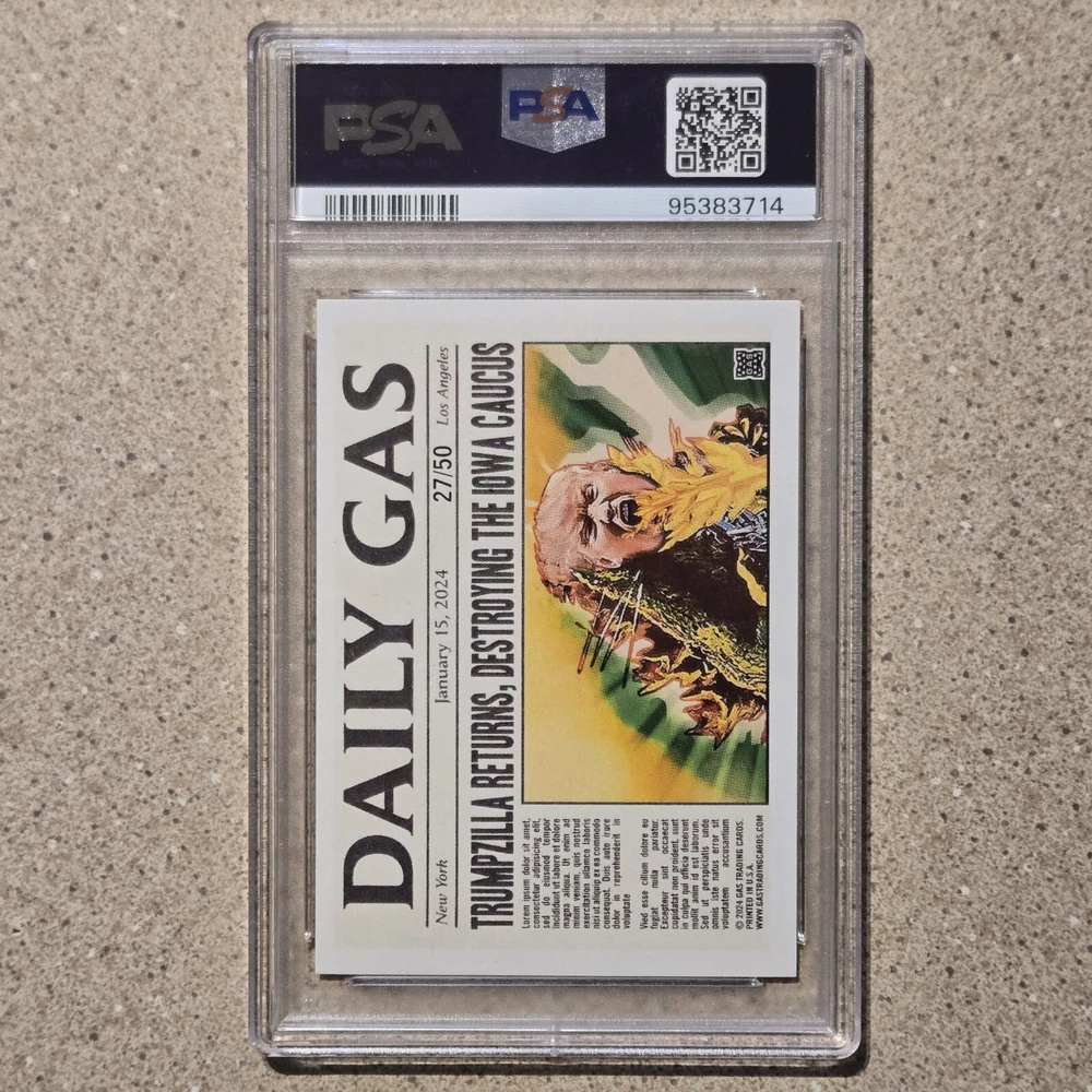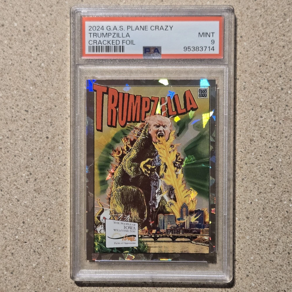 2024 GAS Donald Trump TRUMPZILLA Godzilla IOWA Cracked Foil Prism /50 Card PSA 9 is a rare and unique non-sport trading card featuring the character Donald John Trump in a parody style. Manufactured by Leaf News Flash, this English-language card is part of a limited edition series with only 50 copies in existence. The card showcases a prism design that adds a striking visual element to any collection, making it a must-have for fans of politics, history, and government memorabilia.